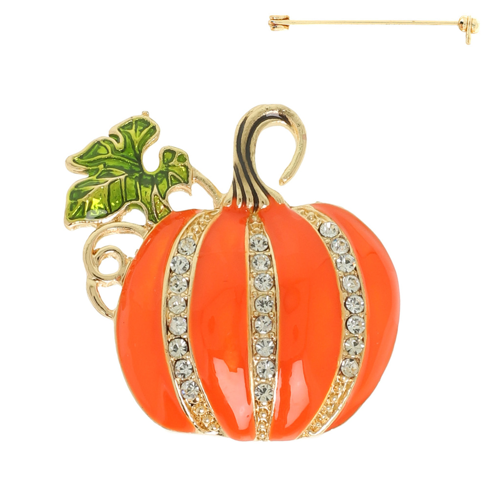 HALLOWEEN RHINESTONE PAVE STRIPED PUMPKIN BROOCH PIN WITH GREEN LEAF DETAIL