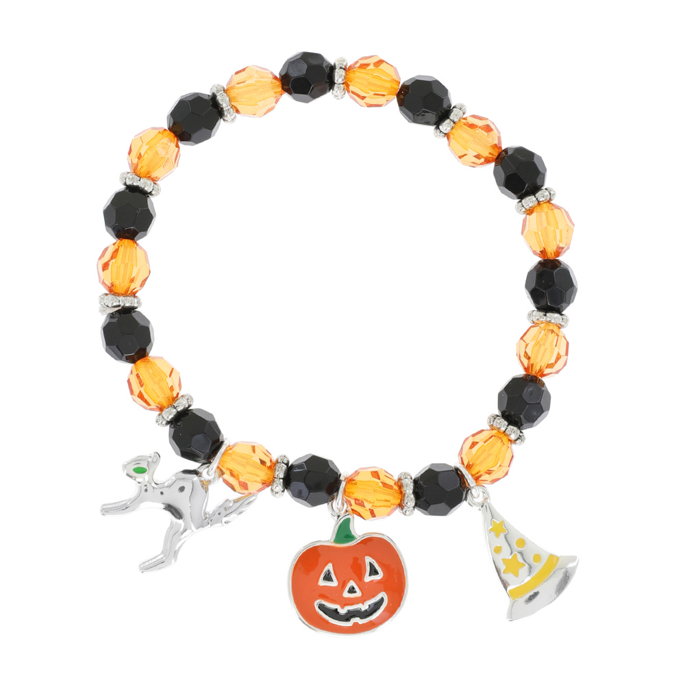 Halloween Jack O Lantern Pumpkin, Cat, Witch Hat Charms Bead Stretch Bracelet