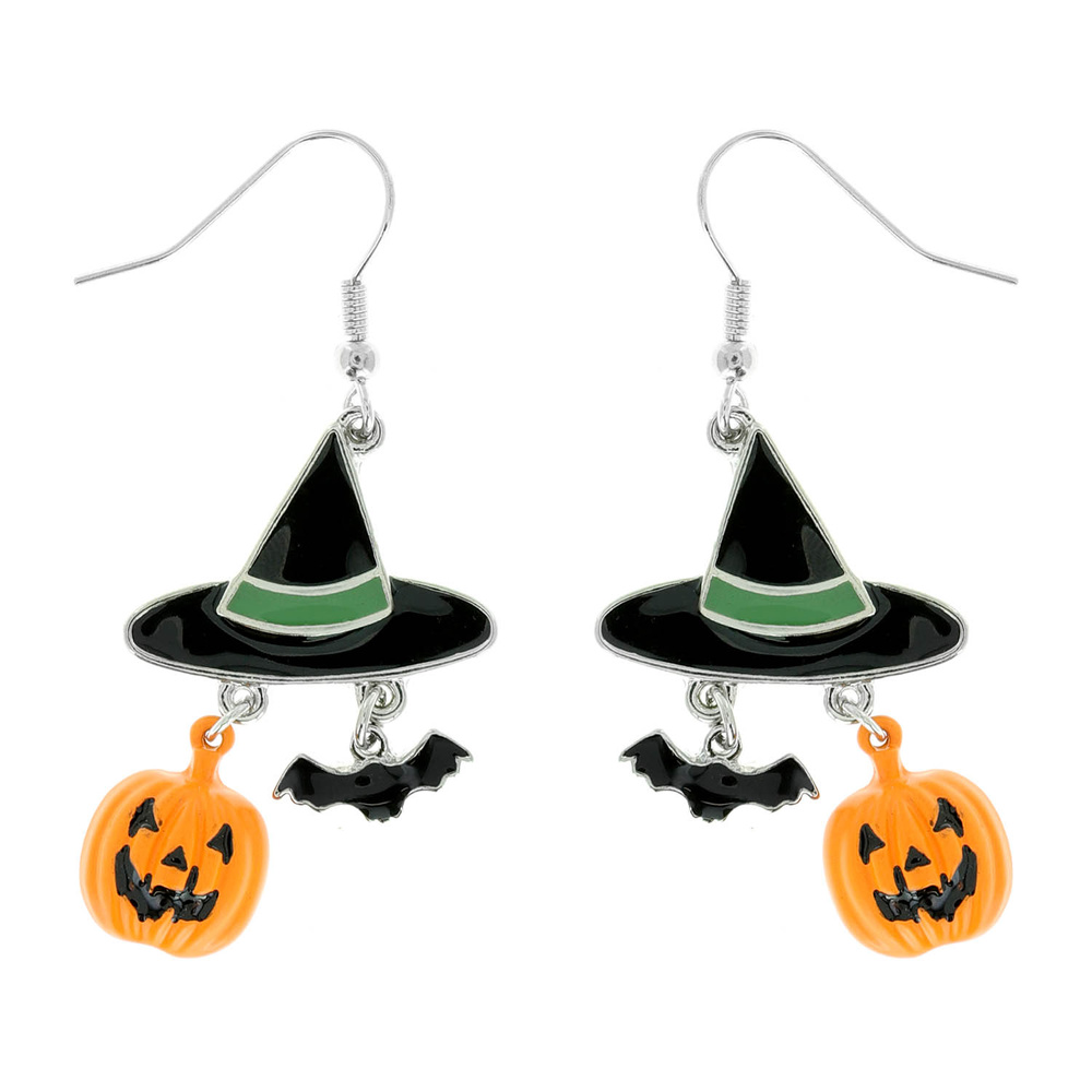Halloween Witch Hat With Bat And Jack O Lantern Pumpkin Dangle Earrings