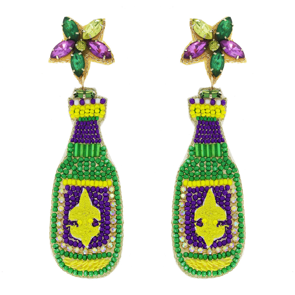 Jeweled Mardi Gras Alcohol Bottle Handmade Beaded Embroidery Novelty Dangle And Drop Earrings