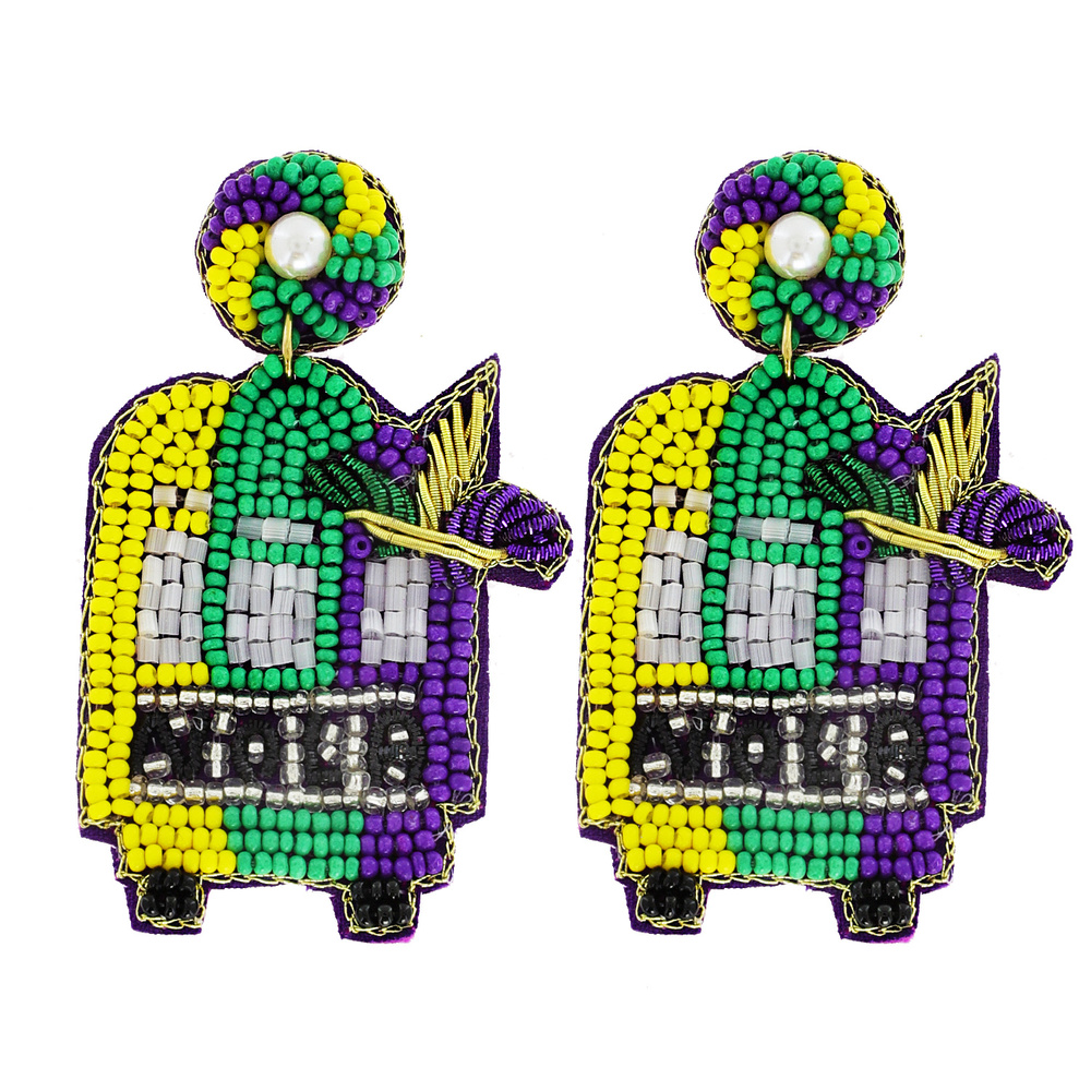 Mardi Gras Nola New Orleans, Louisiana Party Bus Handmade Beaded Embroidery Novelty Dangle And Drop Earrings
