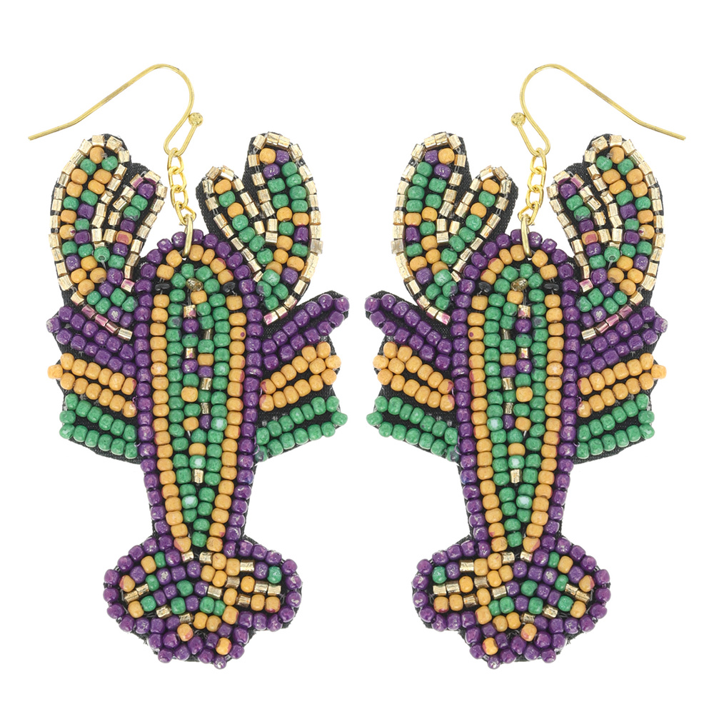 2-TIER CRAYFISH SEED BEAD HANDMADE BEADED DANGLE AND DROP HOOK NOVELTY MARDI GRAS EARRINGS