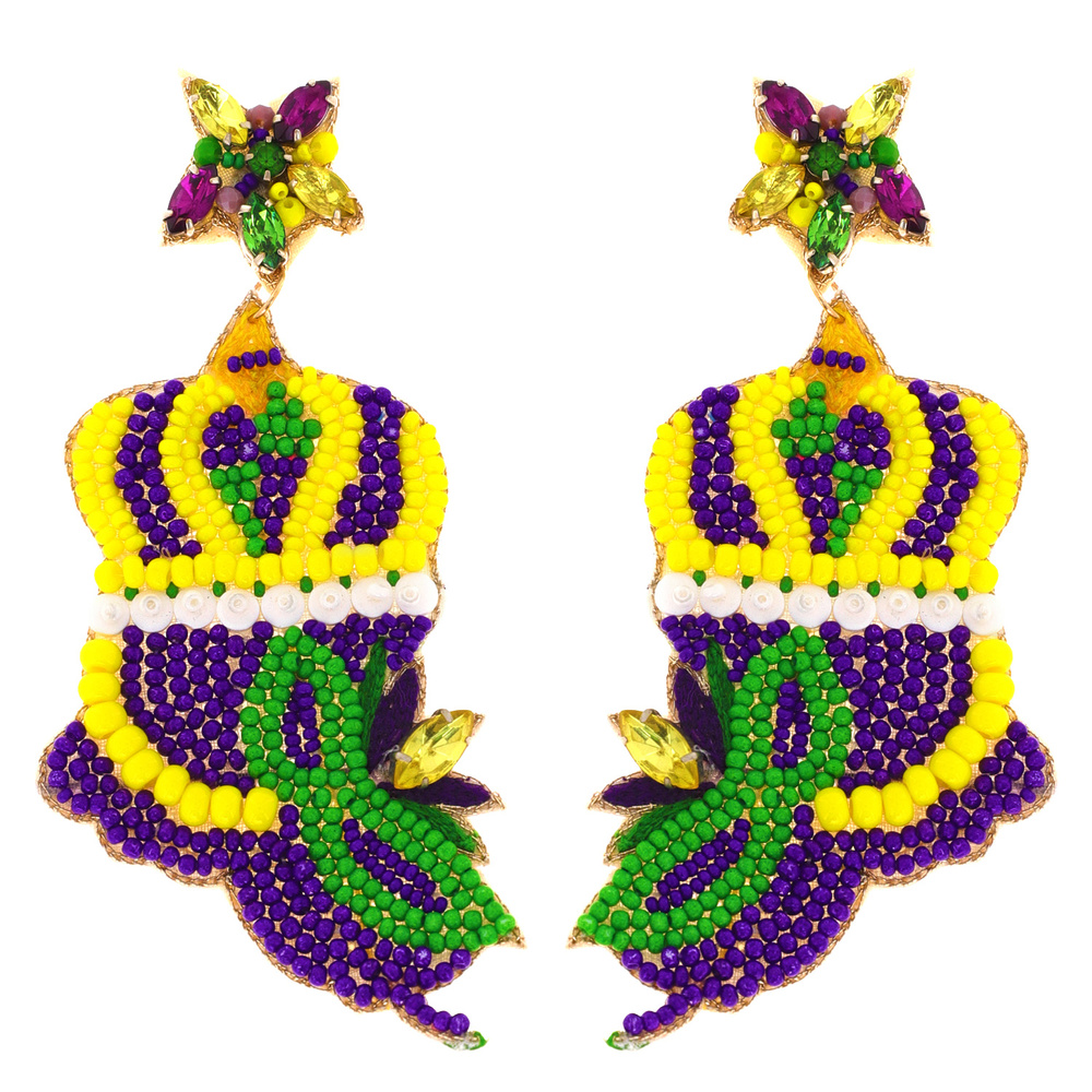 2-tier Jeweled King Crown & Jester Mask Seed Bead Handmade Beaded Embroidery Dangle And Drop Novelty Mardi Gras Earrings