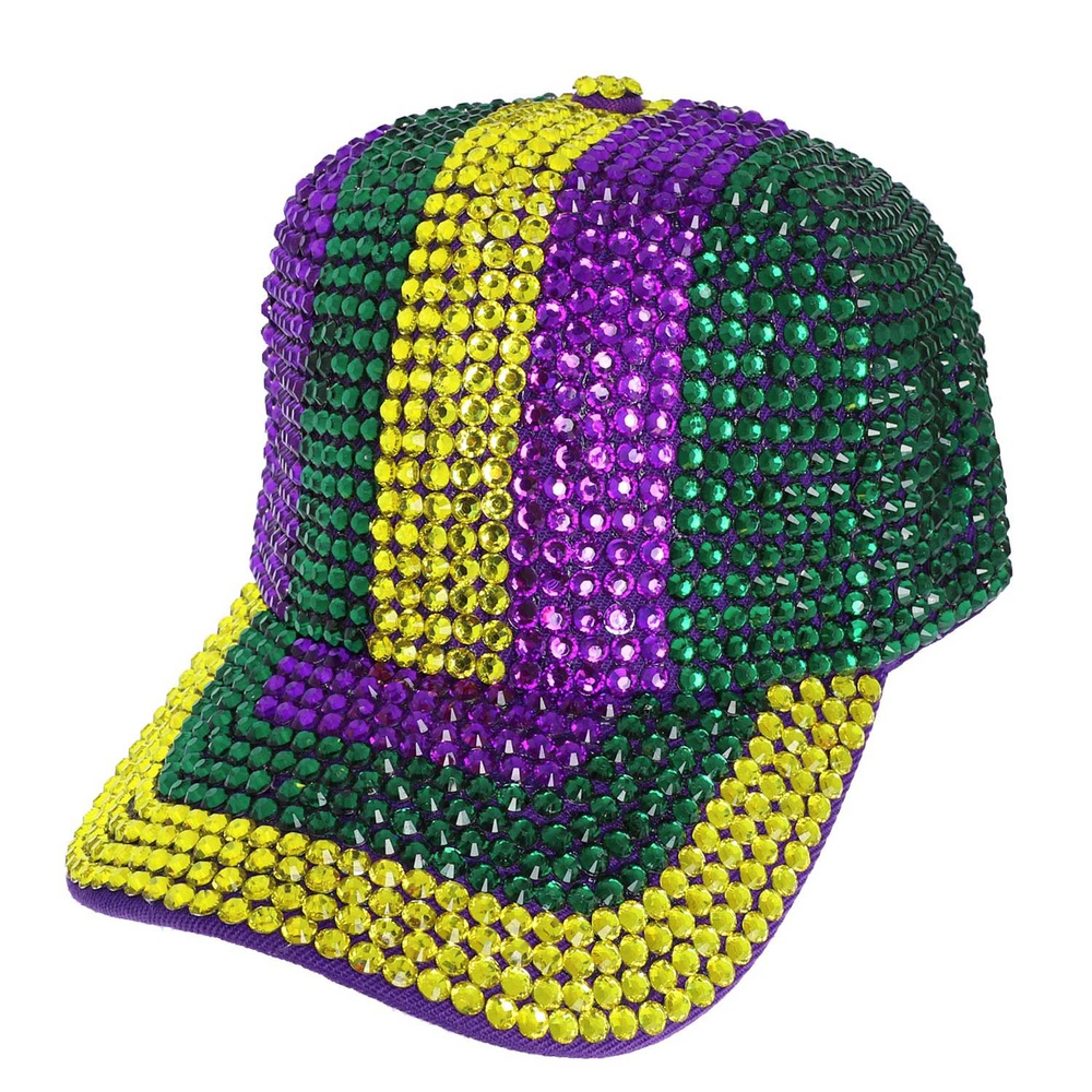 MARDI GRAS TRI COLOR LIGHTWEIGHT BLING CRYSTAL RHINESTONE STUDDED FASHION BASEBALL CAP