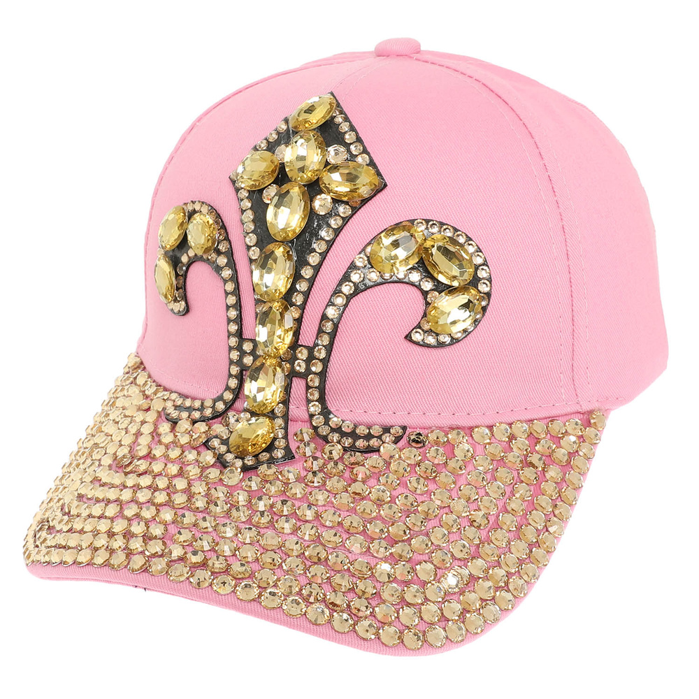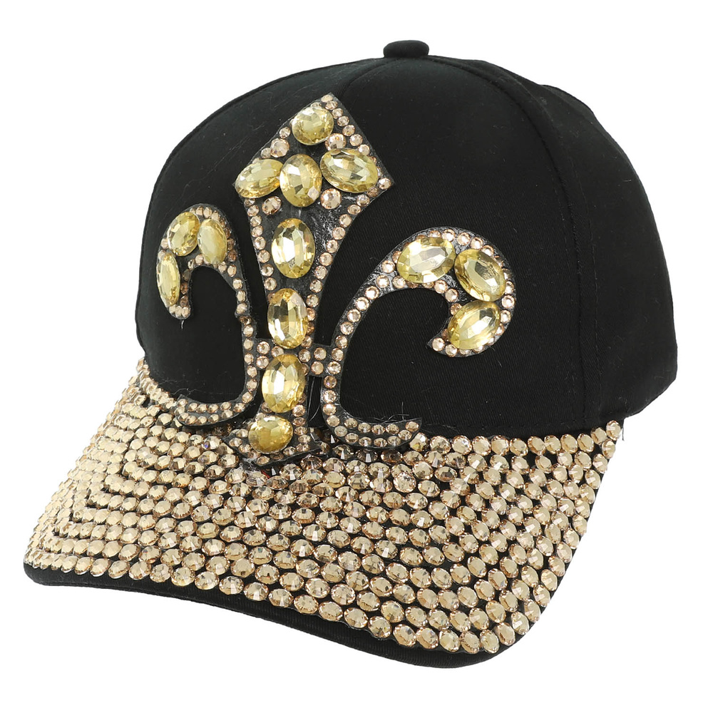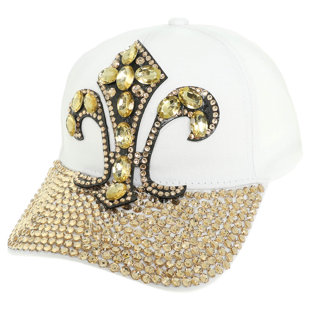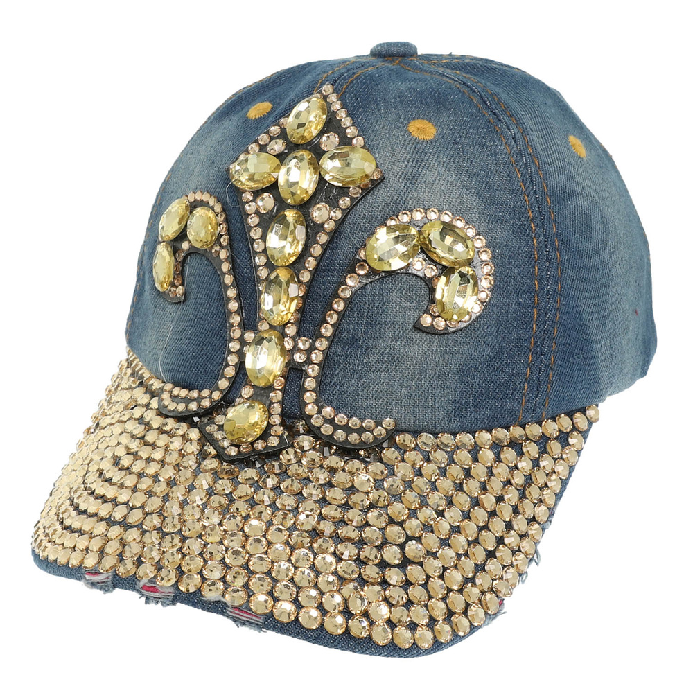 CRYSTAL RHINESTONE EMBELLISHED FLEUR DE LIS DENIM FITTED BASEBALL CAP