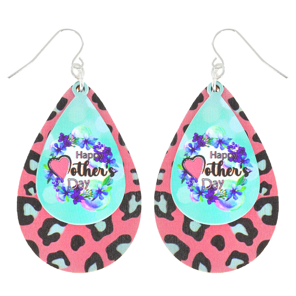 "HAPPY MOTHER'S DAY" MOTHER'S DAY THEMED WOODED GRAPHIC DOUBLE LAYER TEARDROP EARRINGS
