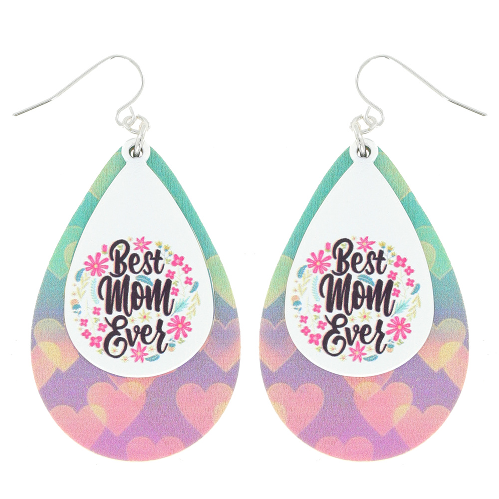 "BEST MOM EVER" MOTHER'S DAY THEMED WOODED GRAPHIC DOUBLE LAYER TEARDROP EARRINGS