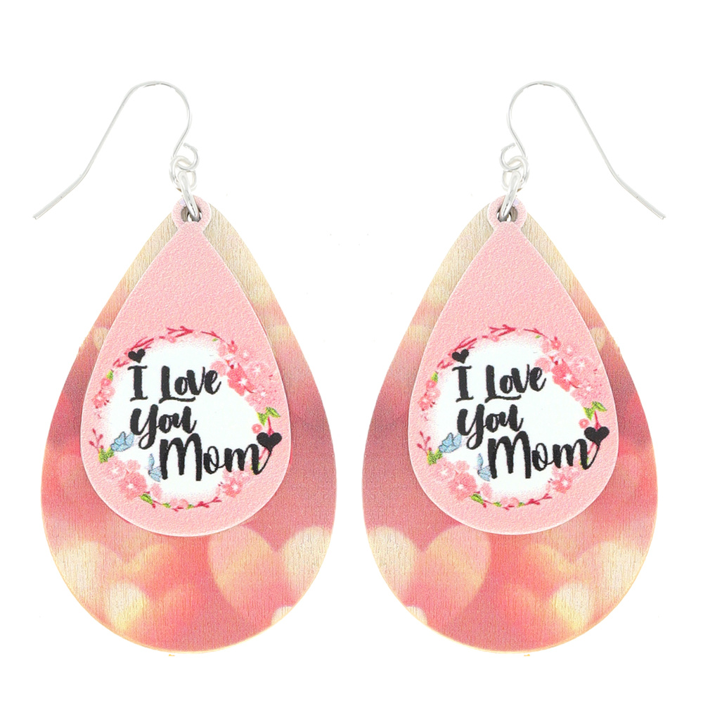 "I LOVE YOU MOM" - MOTHER'S DAY THEMED WOODED GRAPHIC DOUBLE LAYER TEARDROP EARRINGS