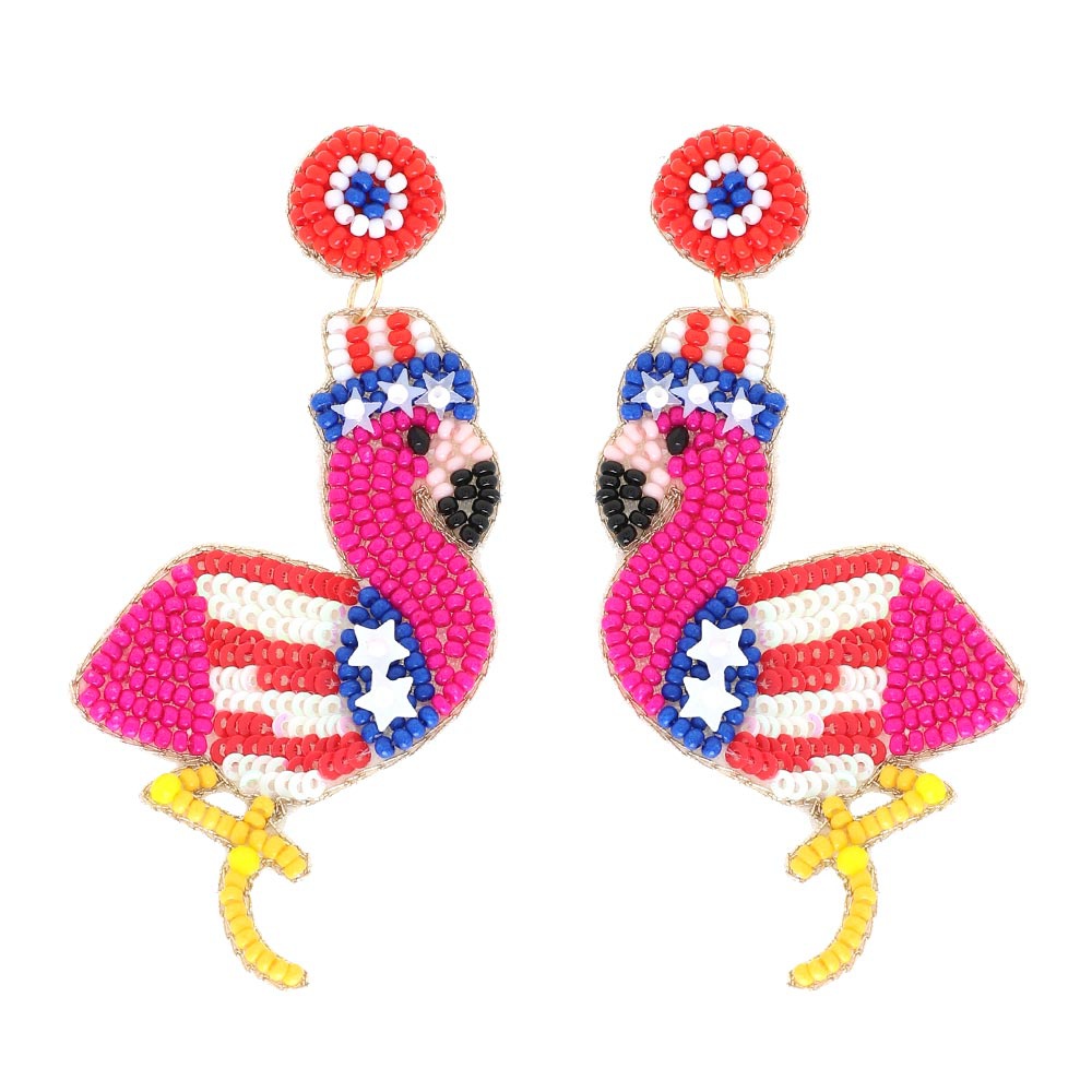 2-TIER PATRIOTIC TROPICAL FLAMINGO BEADED EMBROIDERY LONG DROP EARRINGS