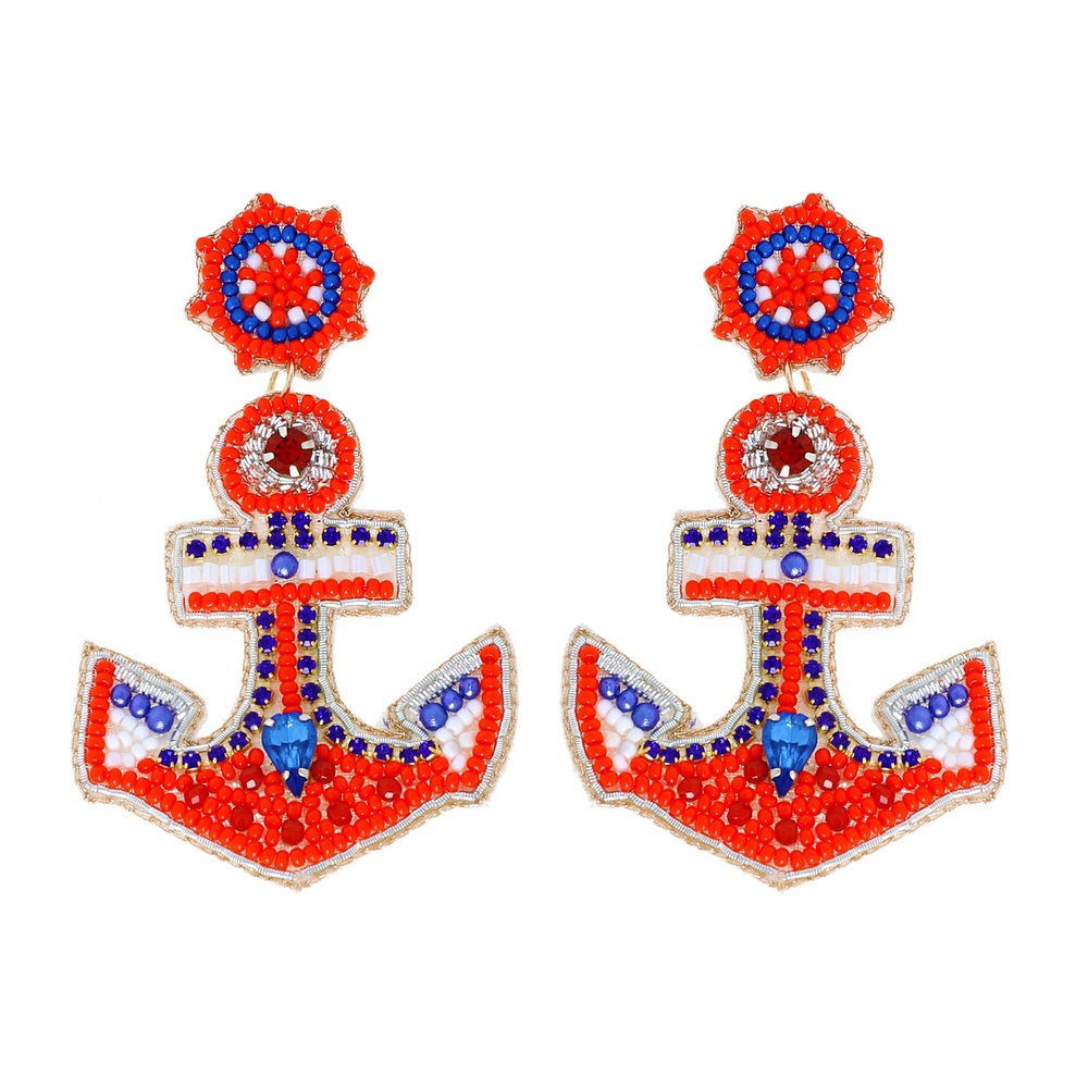 2-tier Jeweled Patriotic Usa Nautical Ship Anchor Beaded Embroidery Dangle And Drop Earrings