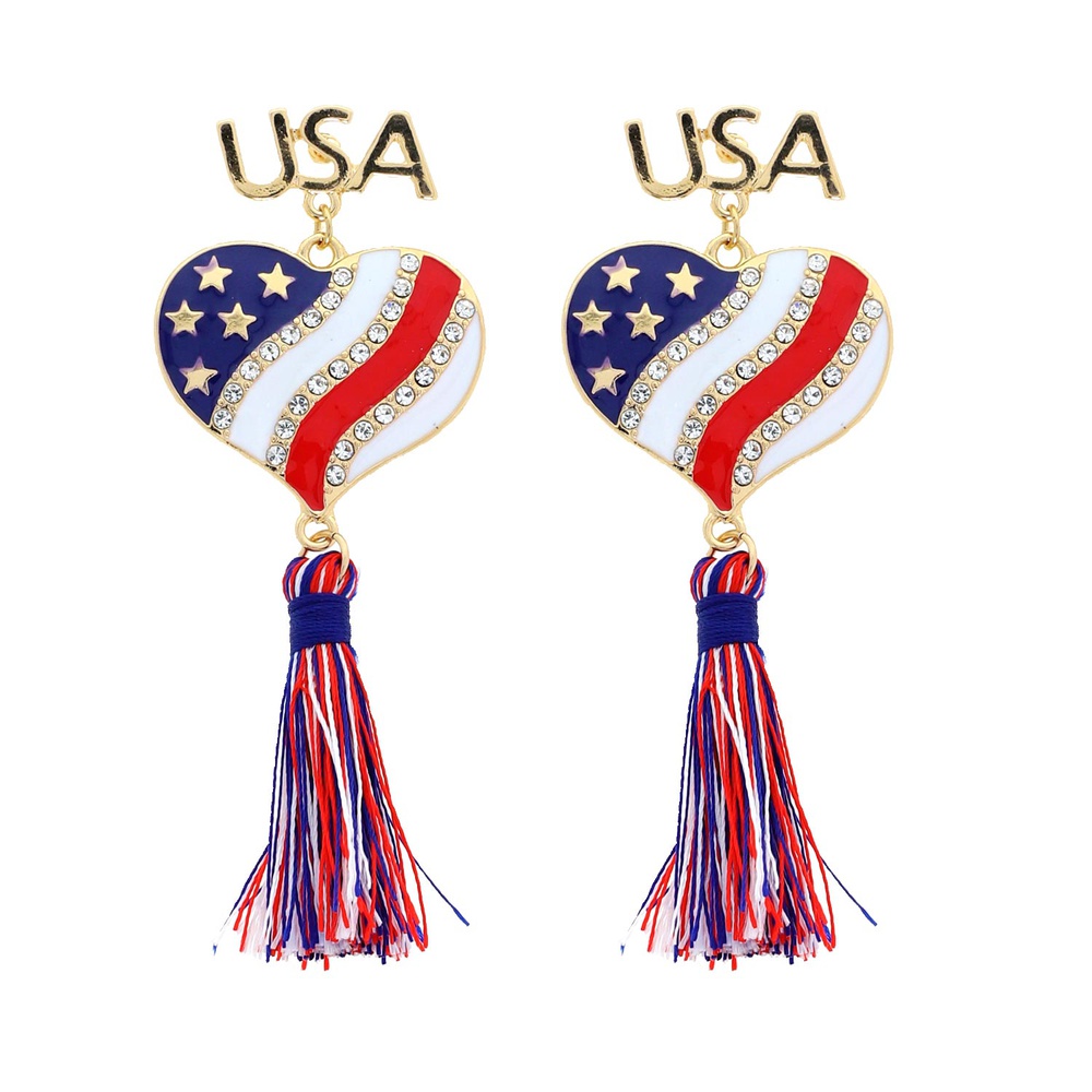 3-TIER USA PATRIOTIC HEART ENAMEL COATED CRYSTAL RHINESTONE LONG DROP TASSEL EARRINGS IN GOLD TONE METAL