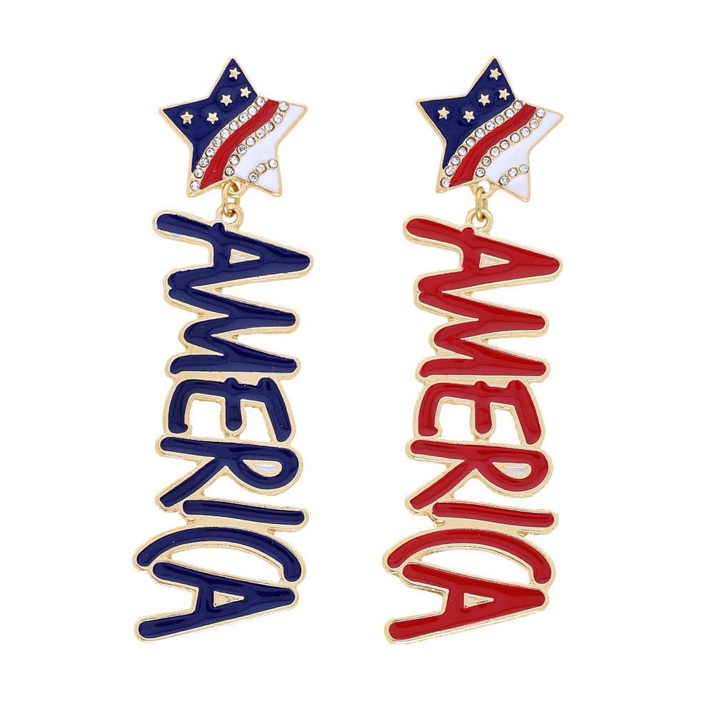 2-TIER PATRIOTIC "AMERICA" ENAMEL COATED CRYSTAL RHINESTONE LONG DROP EARRINGS IN GOLD TONE METAL
