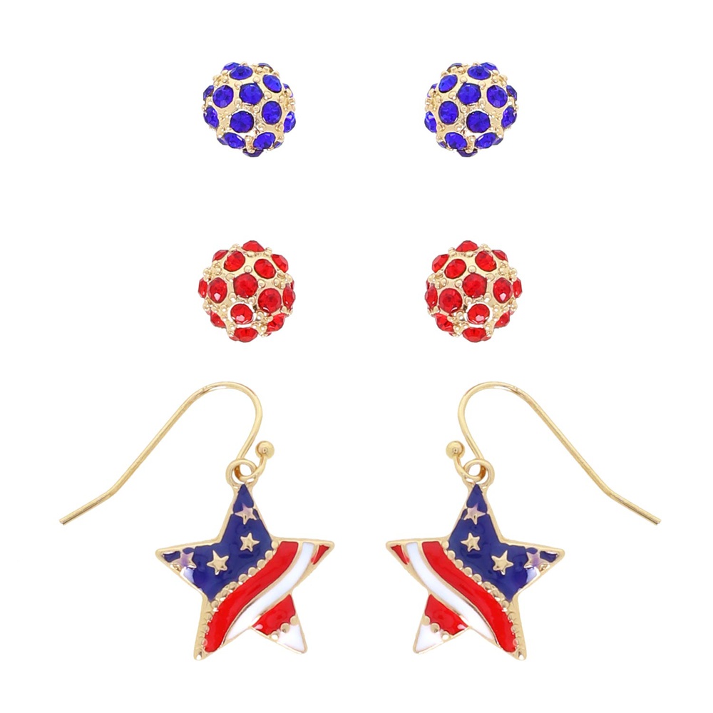 3-PAIR PATRIOTIC STAR CRYSTAL RHINESTONE ENAMEL COATED ASSORTED EARRING SET IN GOLD TONE METAL