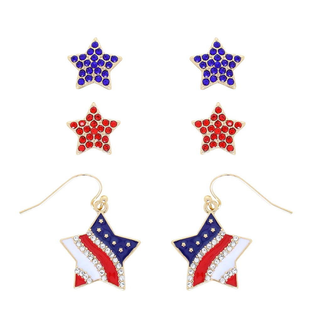 3-PAIR PATRIOTIC STAR CRYSTAL RHINESTONE ENAMEL COATED ASSORTED EARRING SET IN GOLD TONE METAL