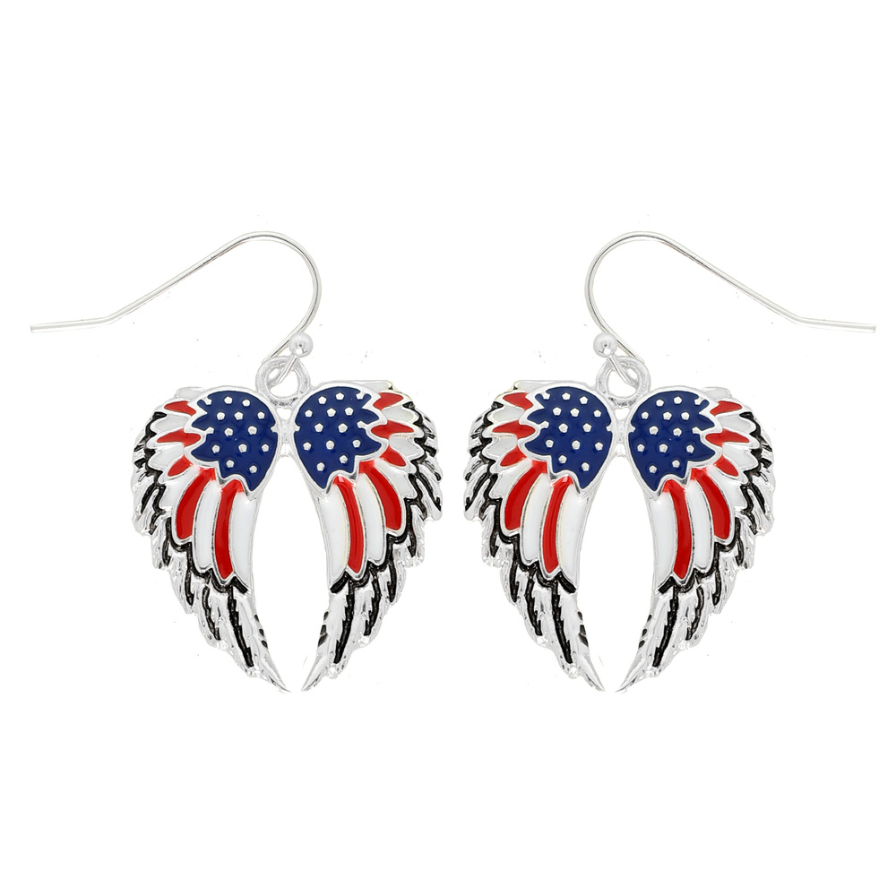 SILVER-TONE PATRIOTIC U.S. FLAG ENAMEL EPOXY POLISHED WING EARRINGS