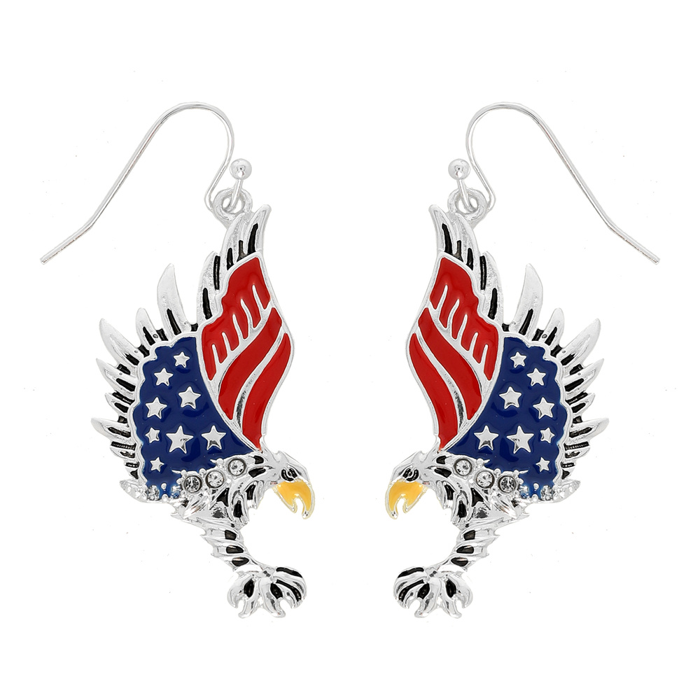 SILVER-TONE PATRIOTIC USA FLAG THEMED ENAMEL EPOXY RESIN AMERICAN EAGLE EARRINGS