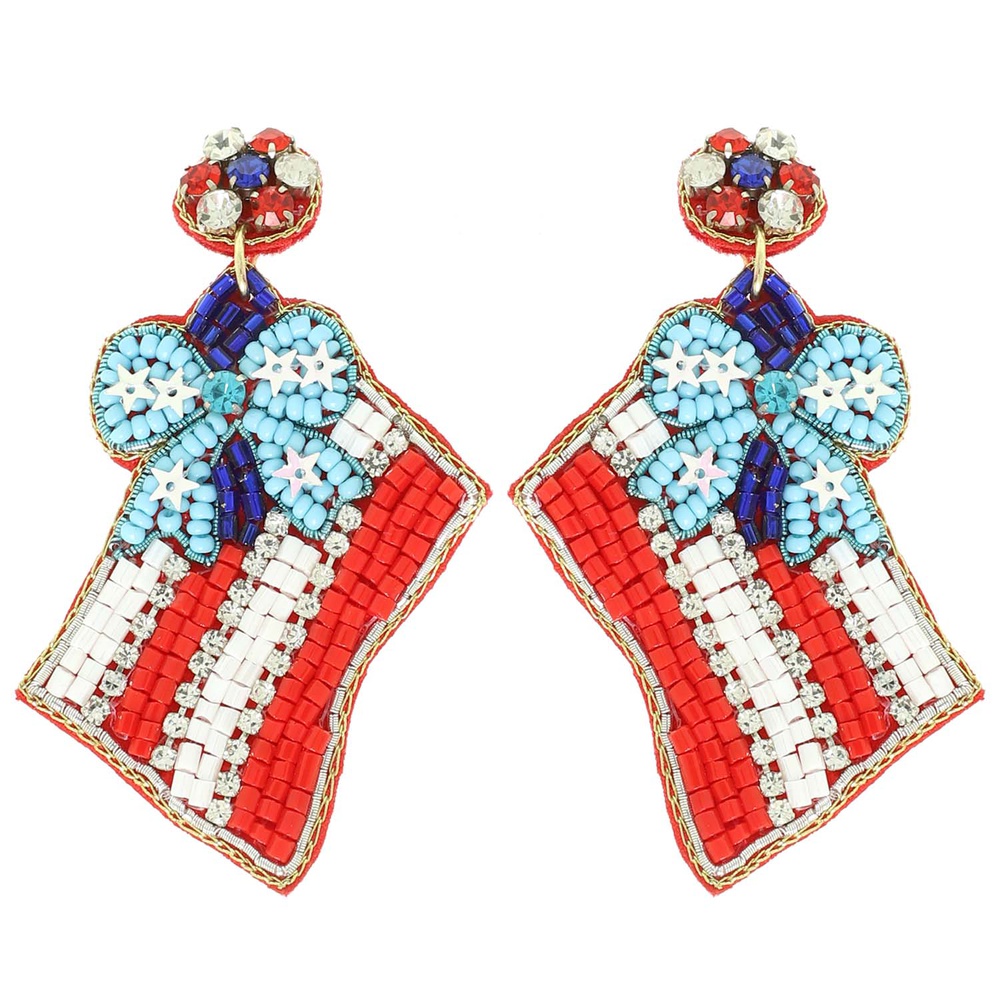 AMERICAN FLAG WITH BOW CRYSTAL SEED BEADED POST DANGLE EARRINGS