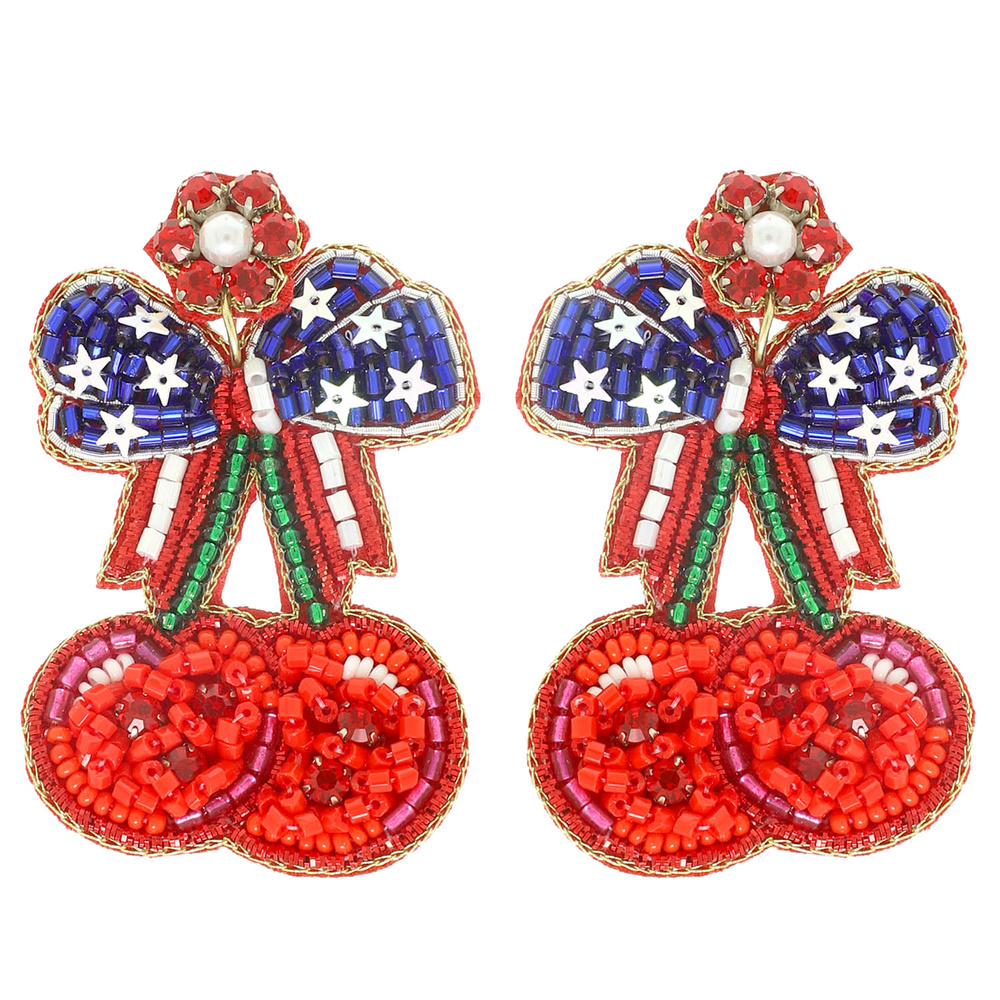 AMERICAN FLAG RIBBONED CRYSTAL SEED BEADED CHERRY POST EARRINGS