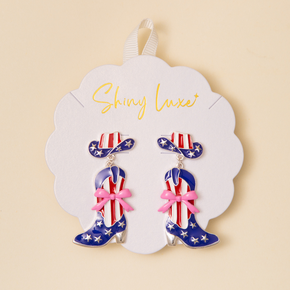 USA THEMED ENAMEL COWGIRL BOOT AND HAT POST DANGLE EARRINGS