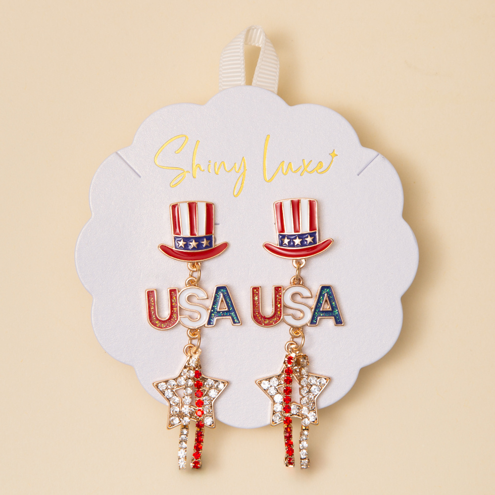 USA THEMED RHINESTONE PAVE ENAMEL HAT AND STAR TASSEL DANGLE EARRINGS