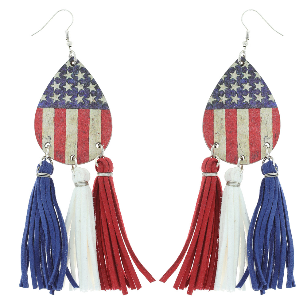 Usa Flag - Wooden Teardrop Suede Fringe Hook Dangle Long Drop Earrings