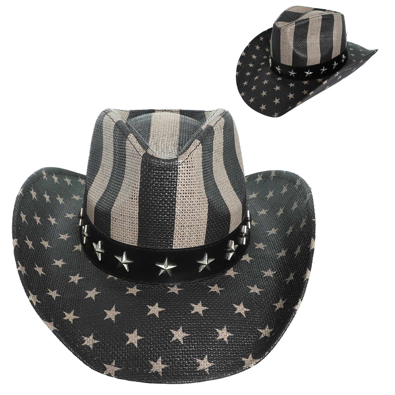 PATRIOTIC STARS AND STRIPES PAPER BRAID COWBOY HAT WITH STAR STUDDED HAT BAND