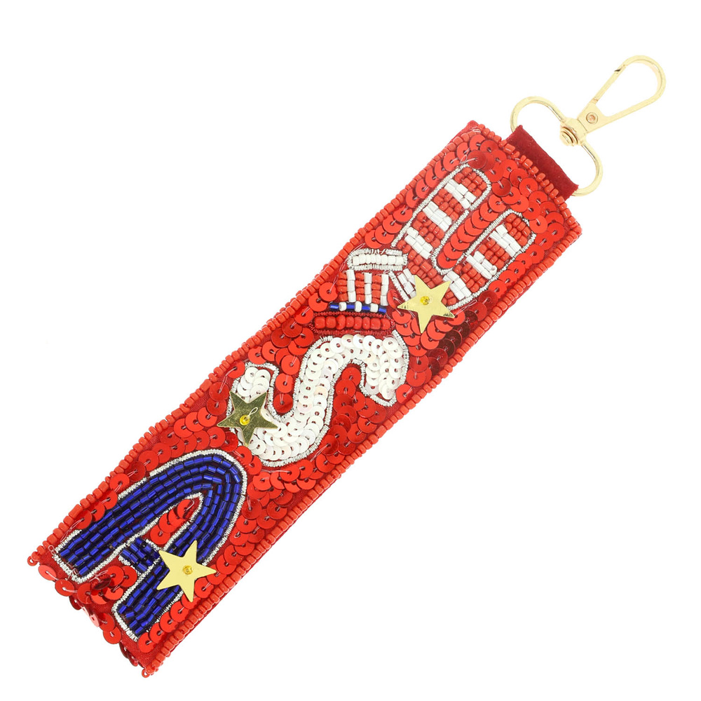 AMERICAN FLAG THEME SEQUINS SEED BEADED "USA" WORD WRISTLET KEYCHAIN