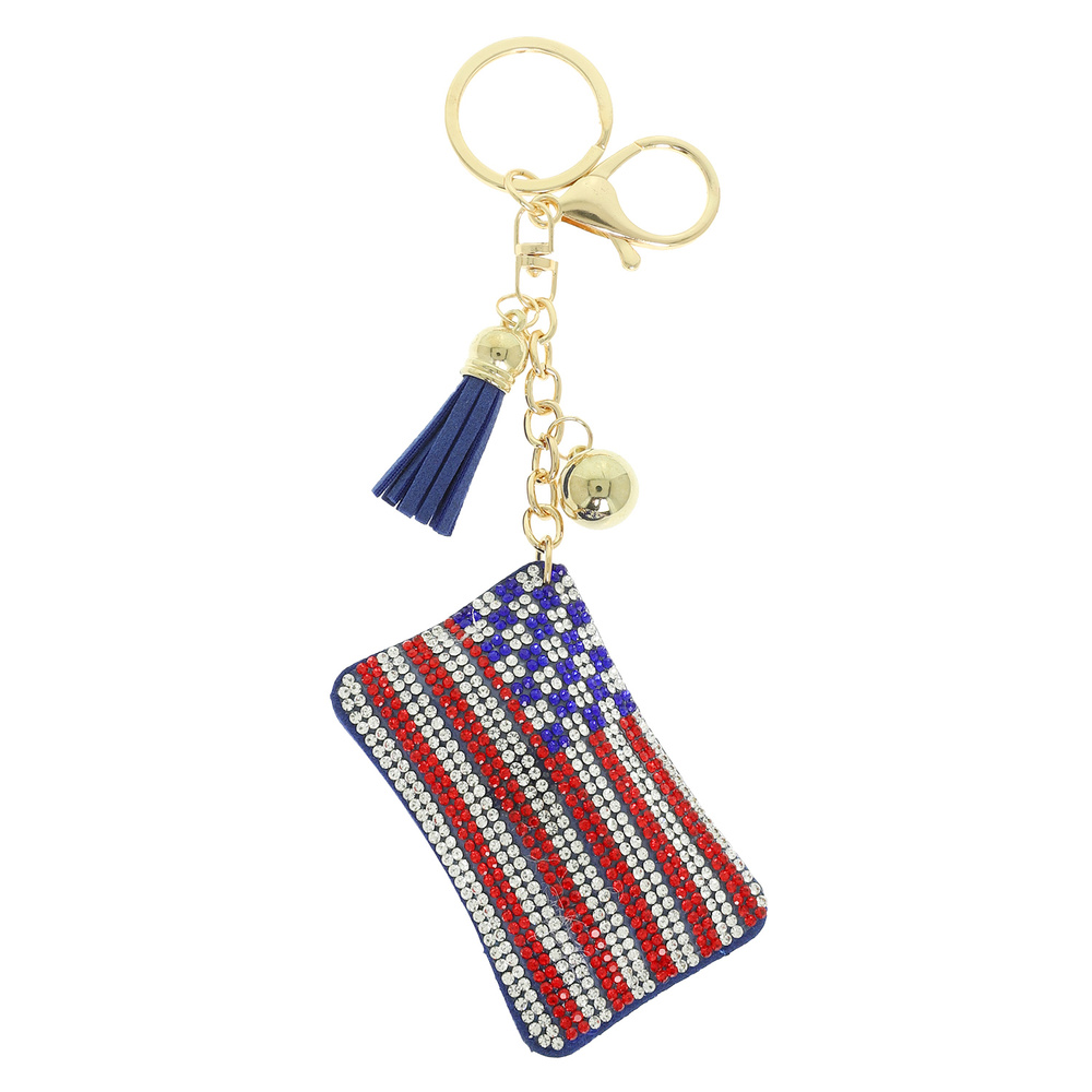 CRYSTAL RHINESTONE PAVE USA FLAG CHARM SUEDE FRINGE KEYCHAIN