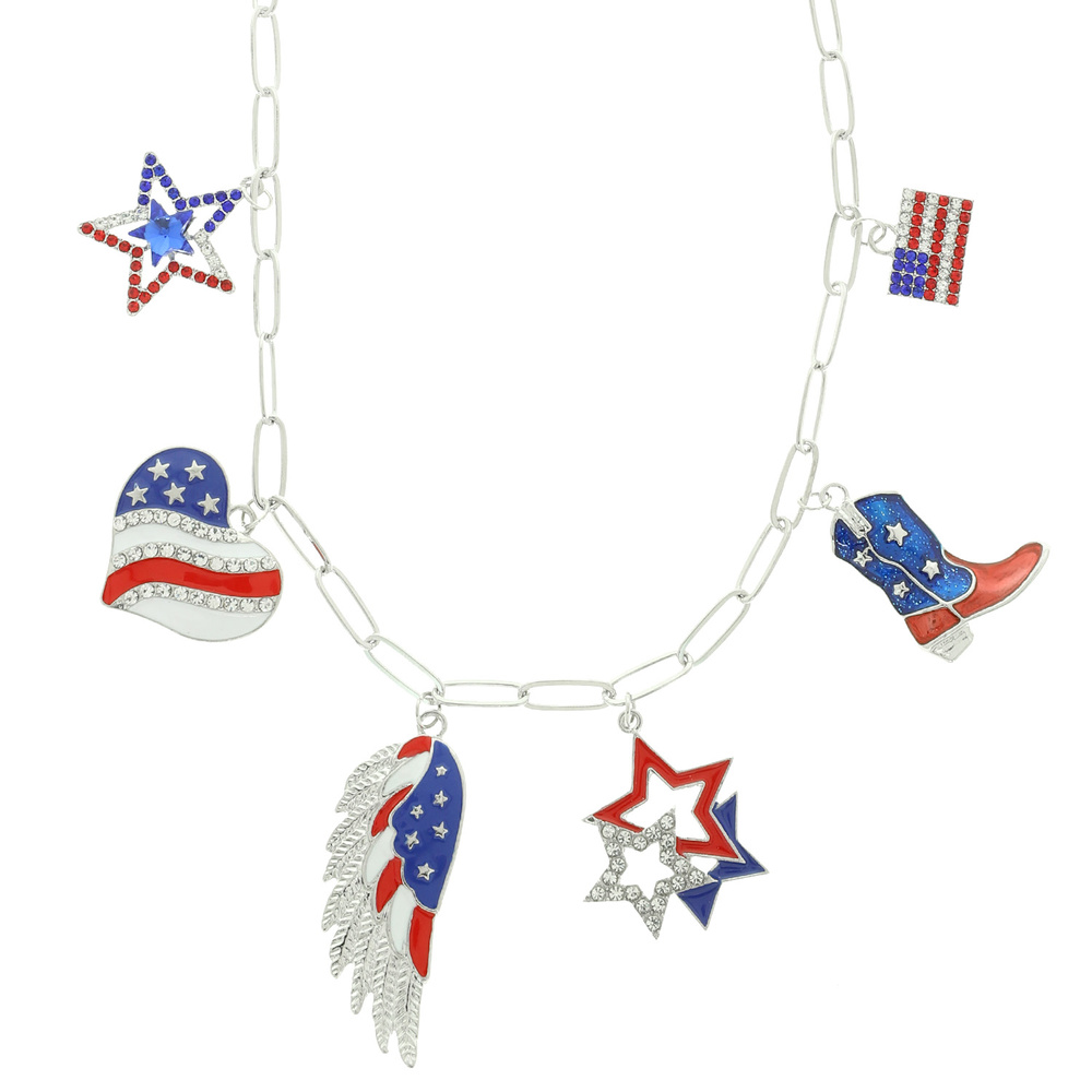 USA THEME RHINESTONE EMBELLISHED MULTI-CHARM CHAIN NECKLACE