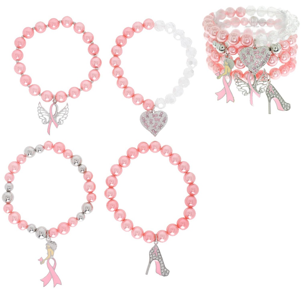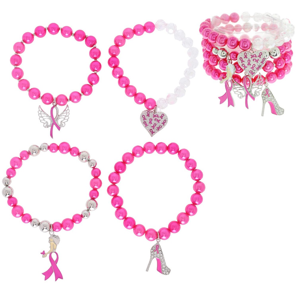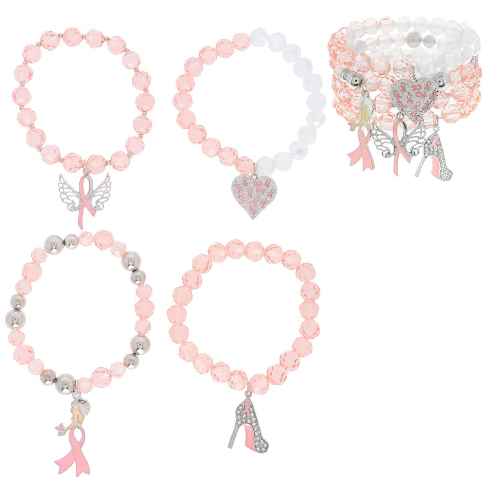 3-PACK BREAST CANCER AWARENESS PINK RIBBON CRYSTAL RHINESTONE ENAMEL COATED BEADED STACKABLE CHARM BRACELET SET