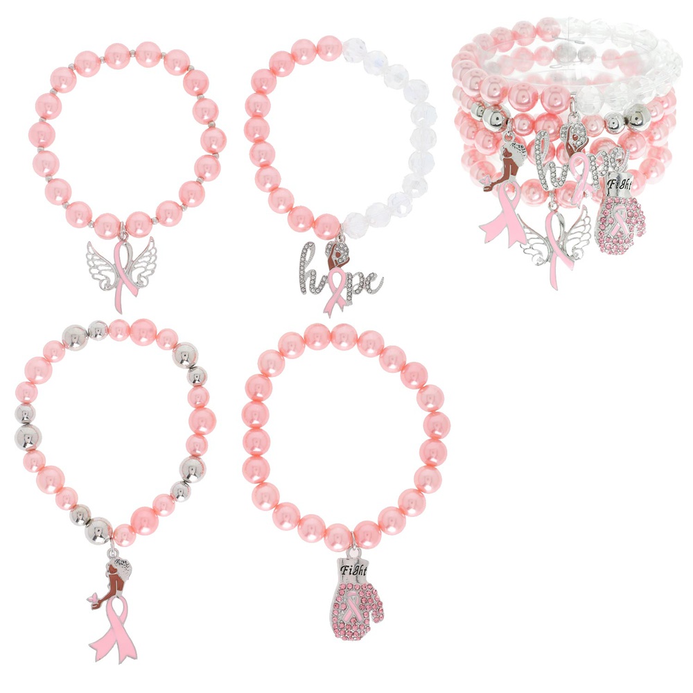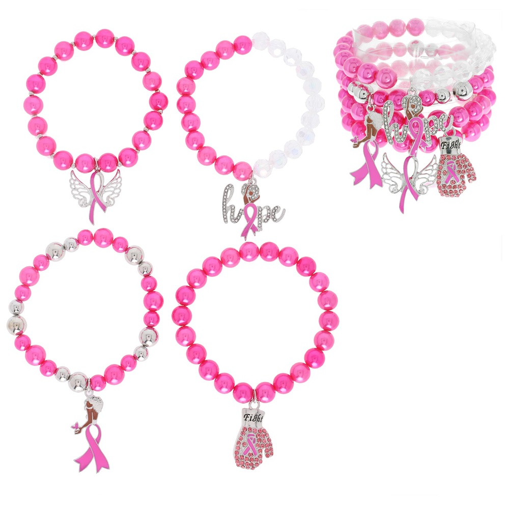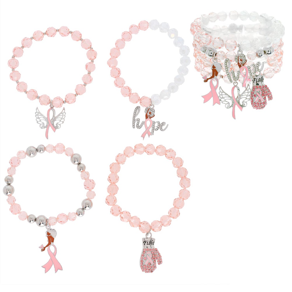 3-PACK BREAST CANCER AWARENESS PINK RIBBON CRYSTAL RHINESTONE ENAMEL COATED BEADED STACKABLE CHARM BRACELET SET
