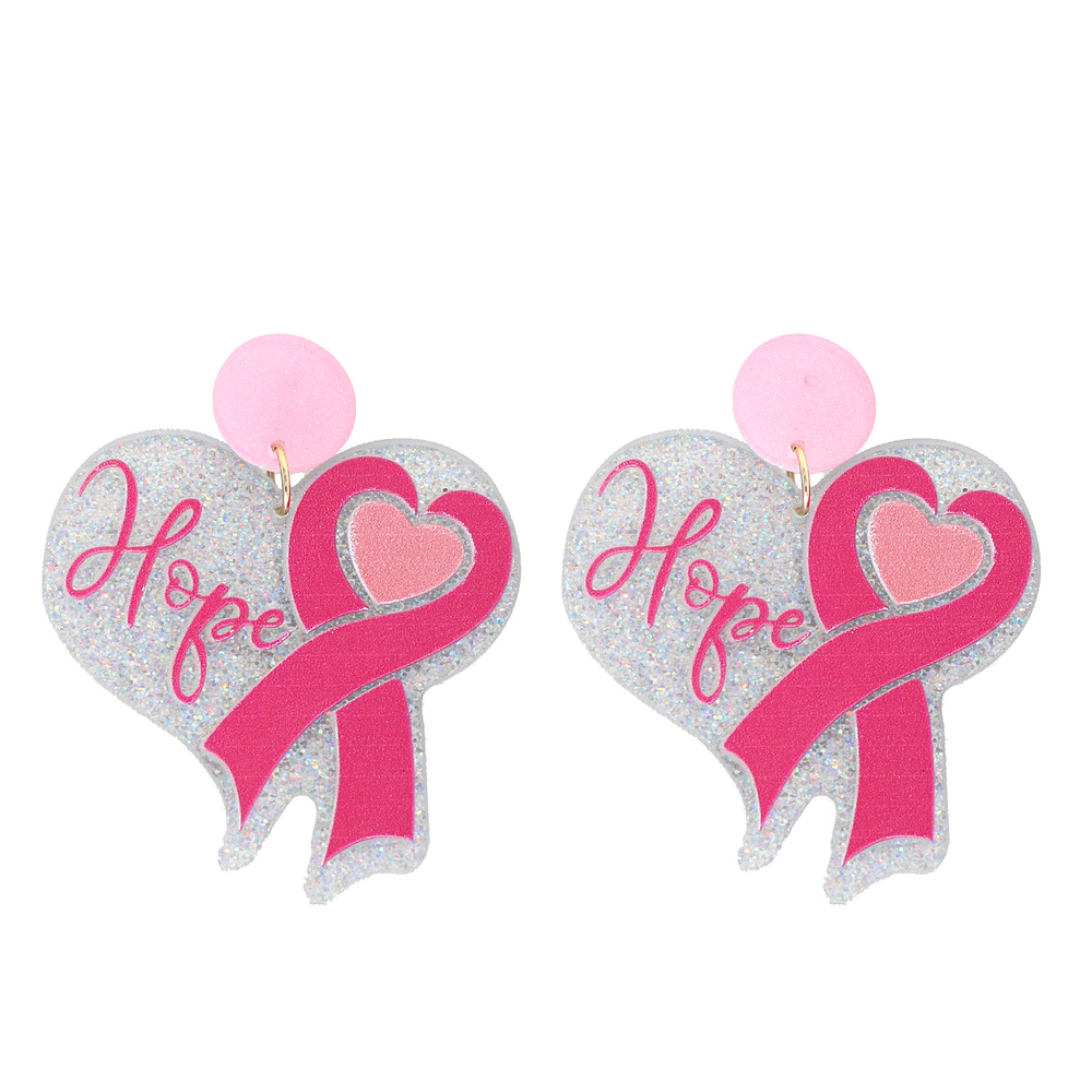 2-tier "hope" Breast Cancer Awareness Pink Ribbon And Heart Acetate Glitter Dangle And Drop Earrings