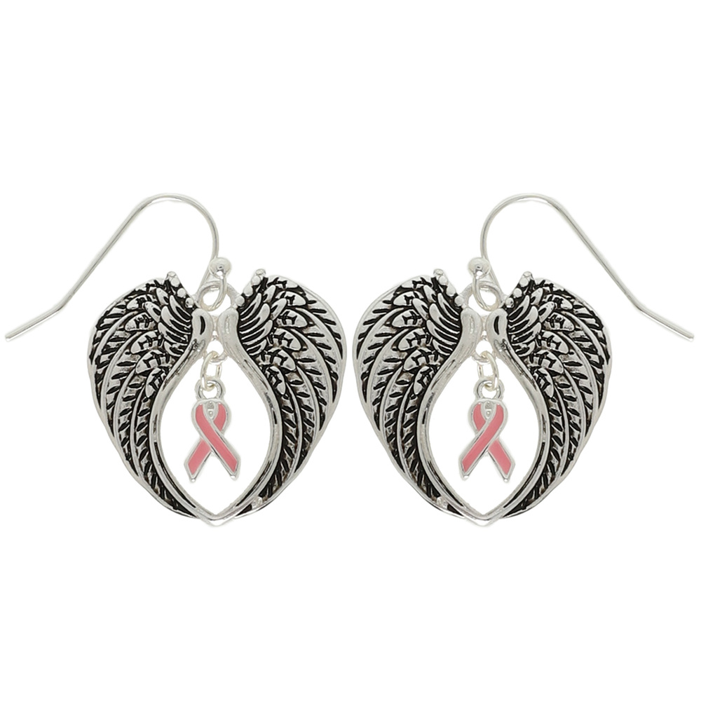 BREAST CANCER AWARENESS PINK RIBBON ANGEL WING CHARM EARRINGS