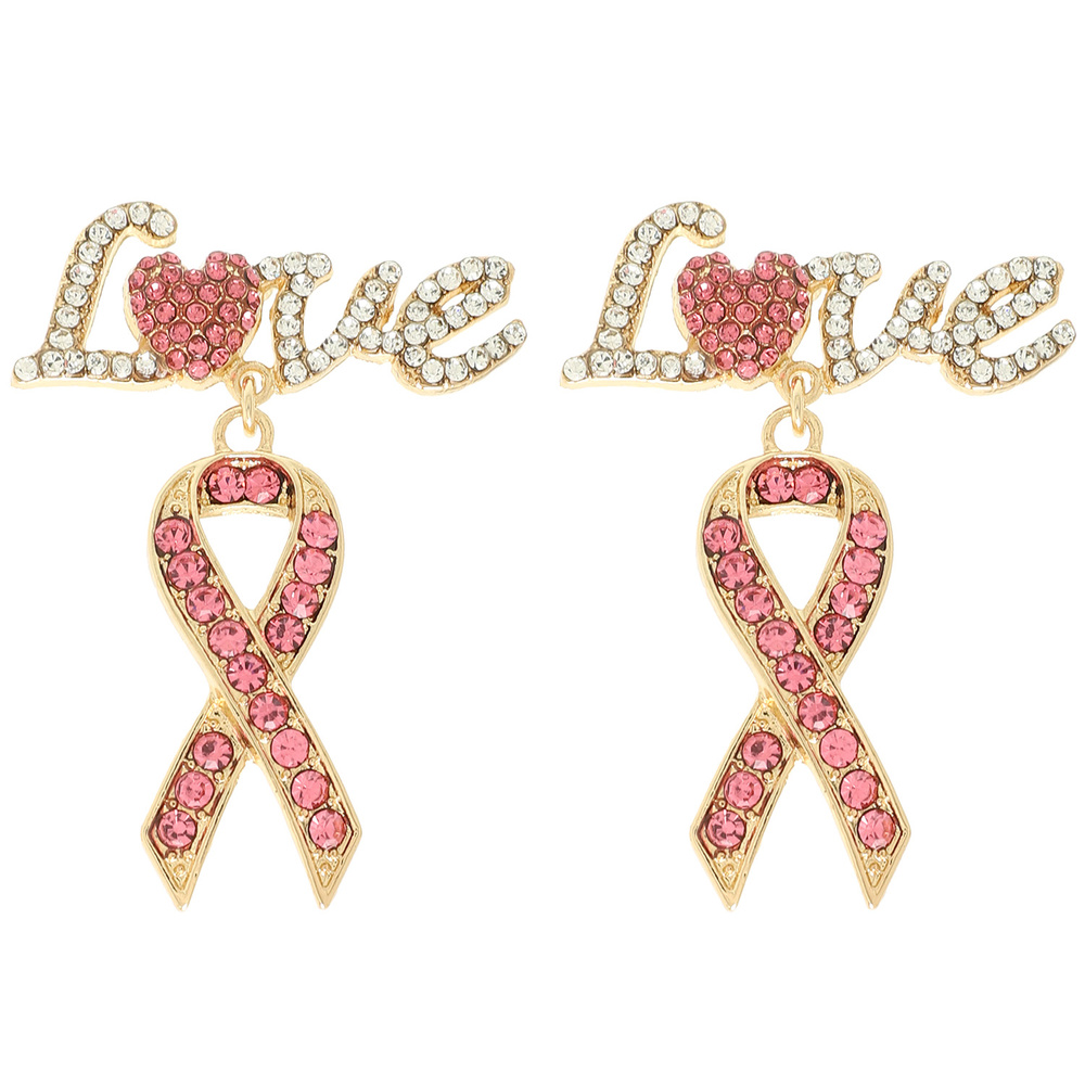 PINK RHINESTONE PAVE BREAST CANCER AWARENESS RIBBON WITH "LOVE" (HEART) EARRINGS