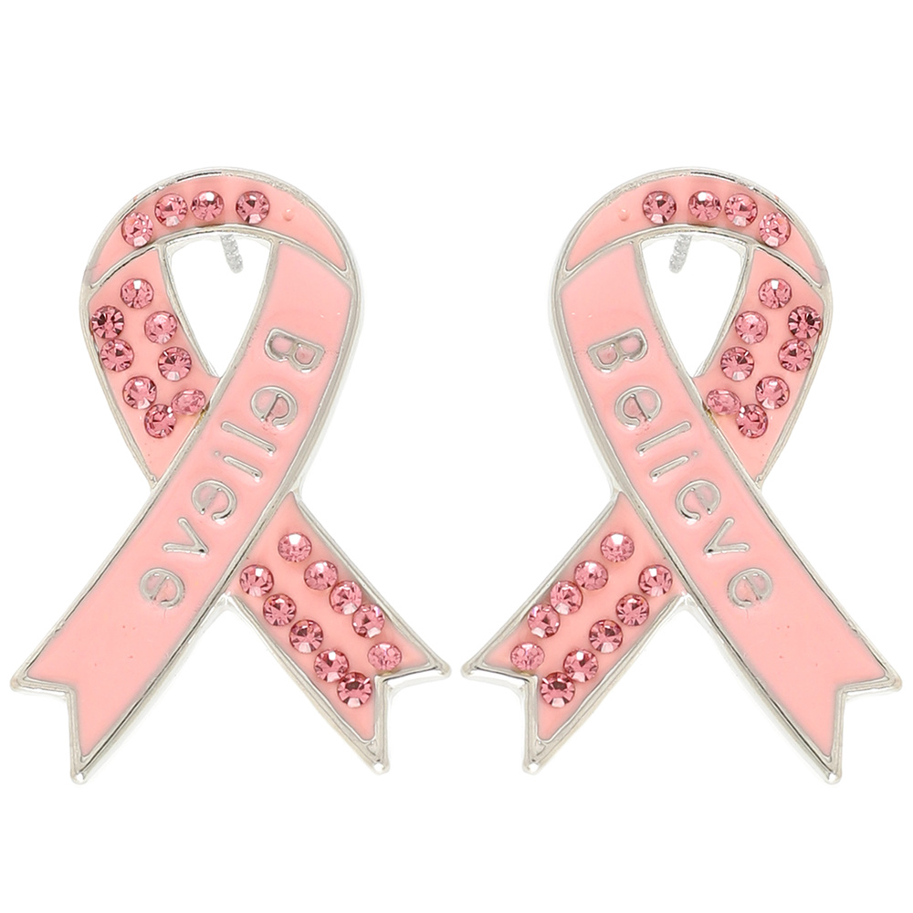 BELIEVE BREAST CANCER AWARENESS PINK RIBBON RHINESTONE PAVE POST EARRING