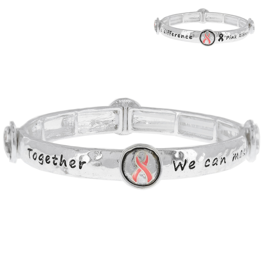 Enamel Pink Ribbon Breast Cancer Awareness "together We Can Make A Difference" Inspirational Message Stretch Bangle Bracelet
