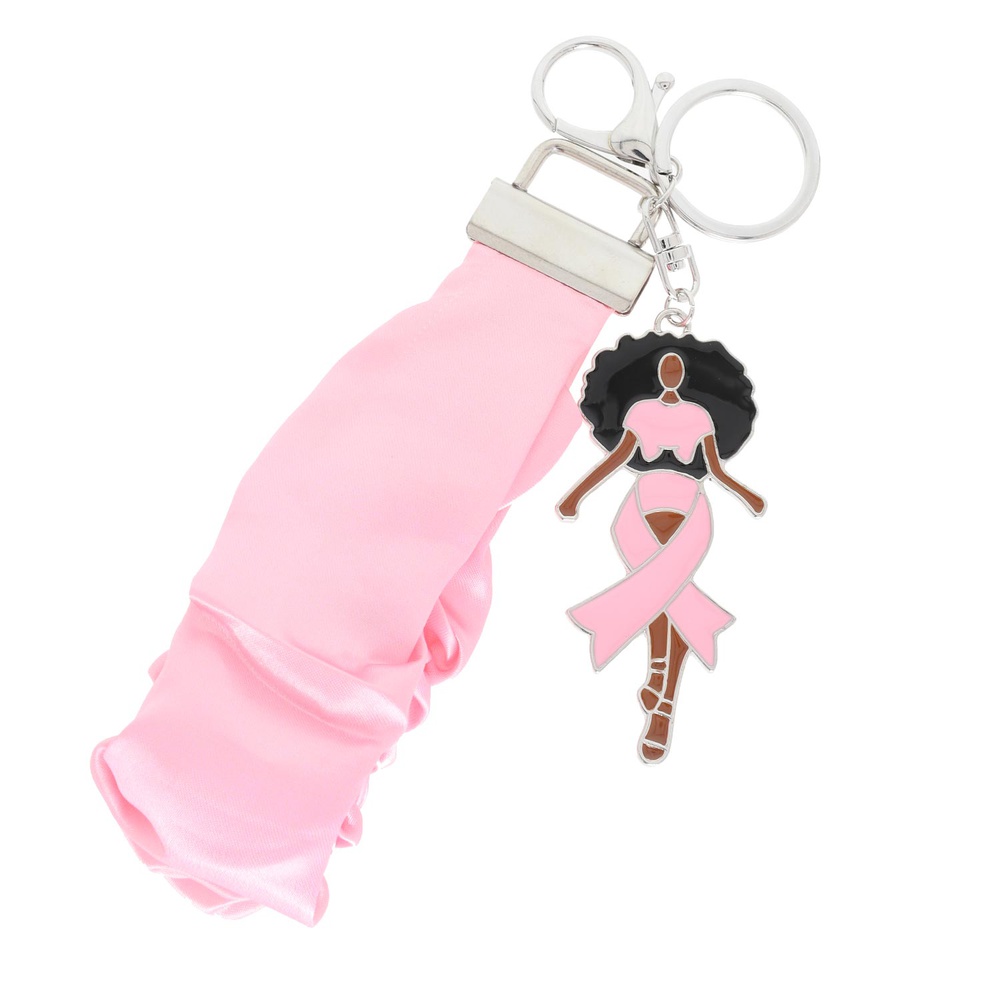 AFRO DIVA PINK RIBBON BREAST CANCER AWARENESS ENAMEL COATED CHARM FABRIC SCRUNCHIE WRISTLET KEYCHAIN FOB WITH DUAL SPLIT RING AND LOBSTER CLAW CLASP