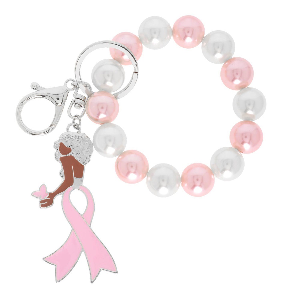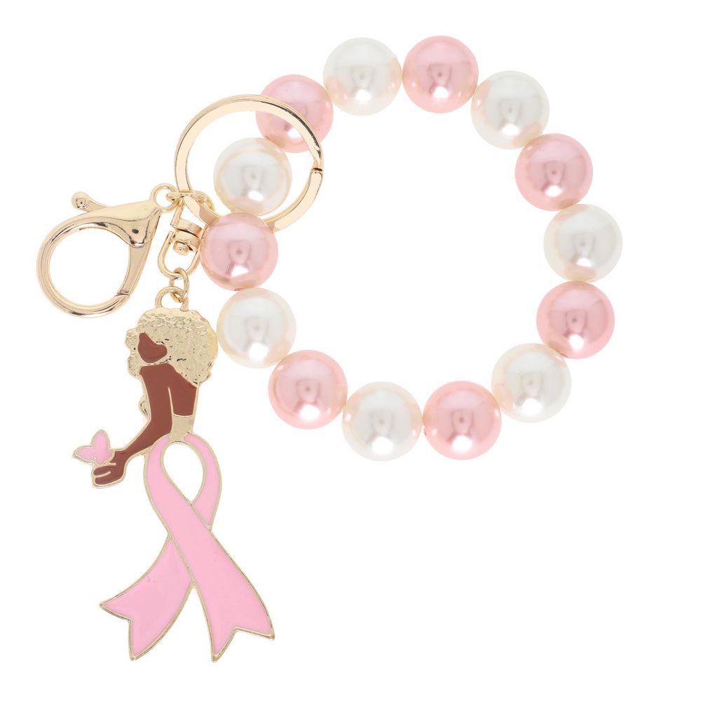AFRO DIVA PINK RIBBON BREAST CANCER AWARENESS ENAMEL COATED PEARL BEADED STRETCH CHARM BRACELET KEYCHAIN WITH DUAL SPLIT RING AND LOBSTER CLAW CLASP