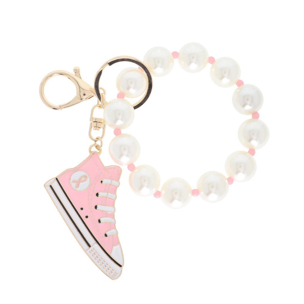 HIGH TOP CANVAS PINK SNEAKERS PINK RIBBON BREAST CANCER AWARENESS ENAMEL COATED PEARL BEADED STRETCH CHARM BRACELET KEYCHAIN WITH DUAL SPLIT RING AND LOBSTER CLAW CLASP