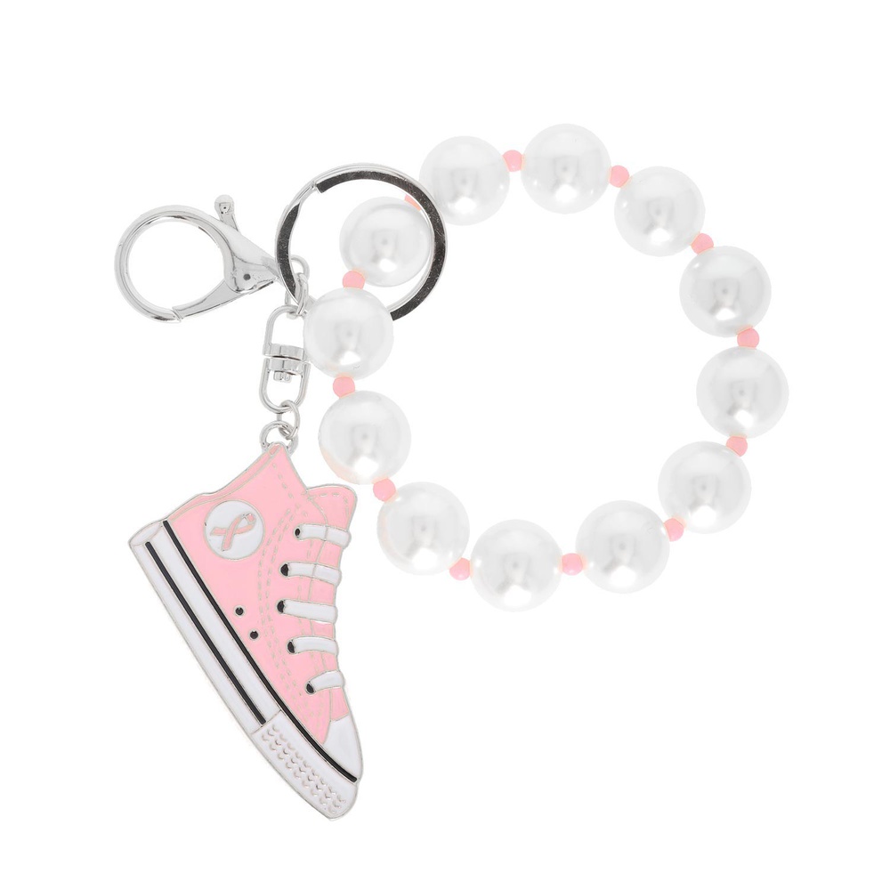 HIGH TOP CANVAS PINK SNEAKERS PINK RIBBON BREAST CANCER AWARENESS ENAMEL COATED PEARL BEADED STRETCH CHARM BRACELET KEYCHAIN WITH DUAL SPLIT RING AND LOBSTER CLAW CLASP