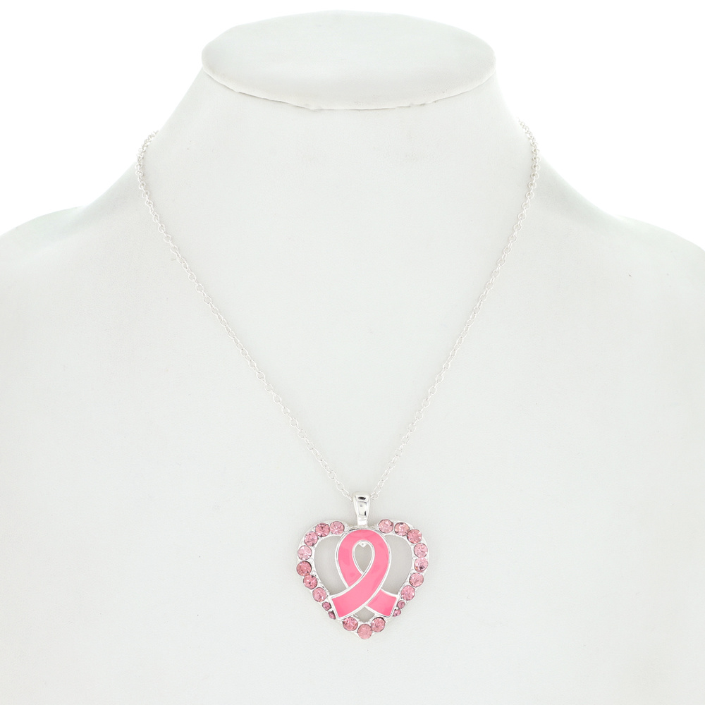 Breast Cancer Awareness, Pink Ribbon Crystal Pave Heart Adjustable Enamel Pendant Necklace