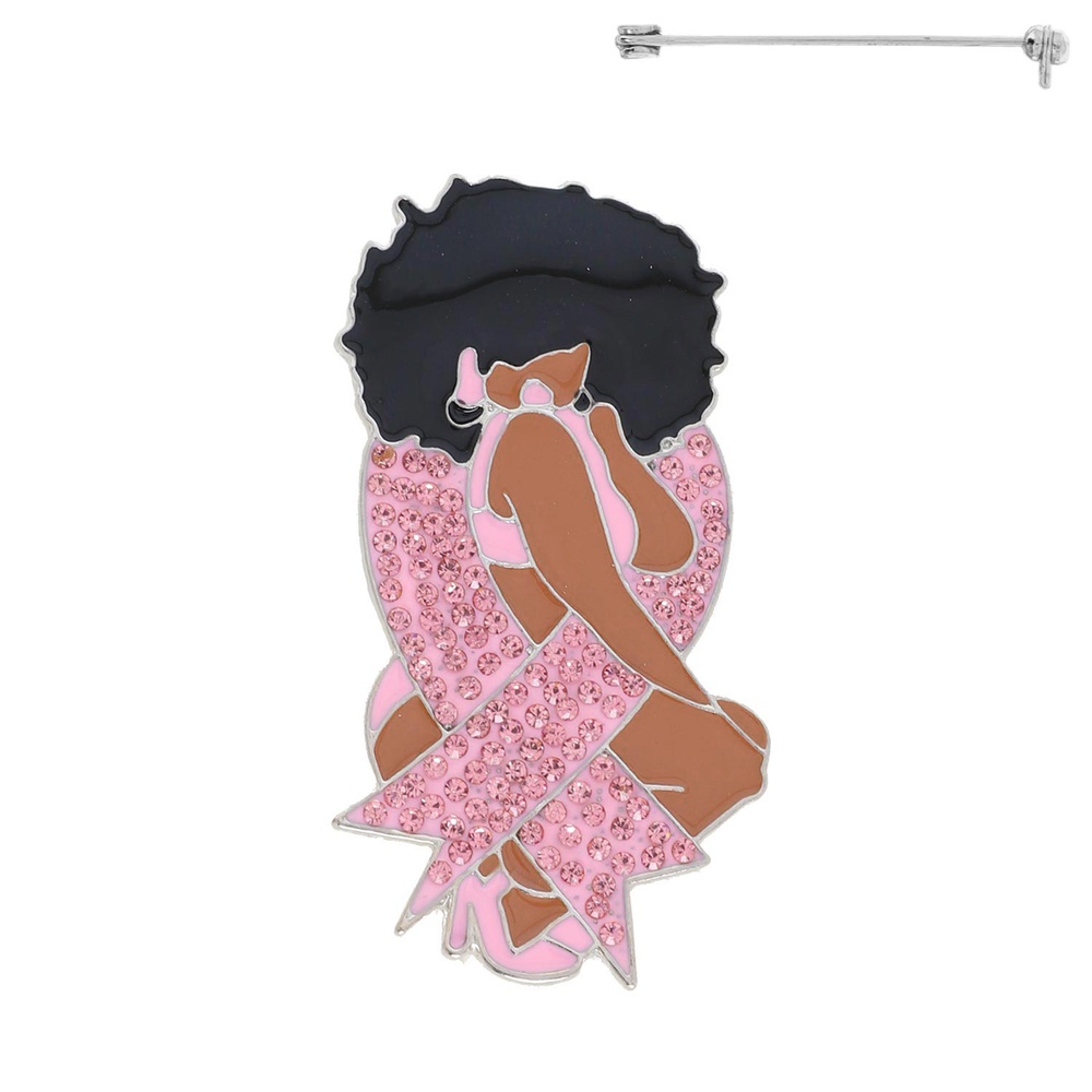 BLACK GIRL MAGIC BREAST CANCER AWARENESS PINK RIBBON CRYSTAL RHINESTONE PAVE GLAM GIRL ENAMEL COATED BROOCH PIN