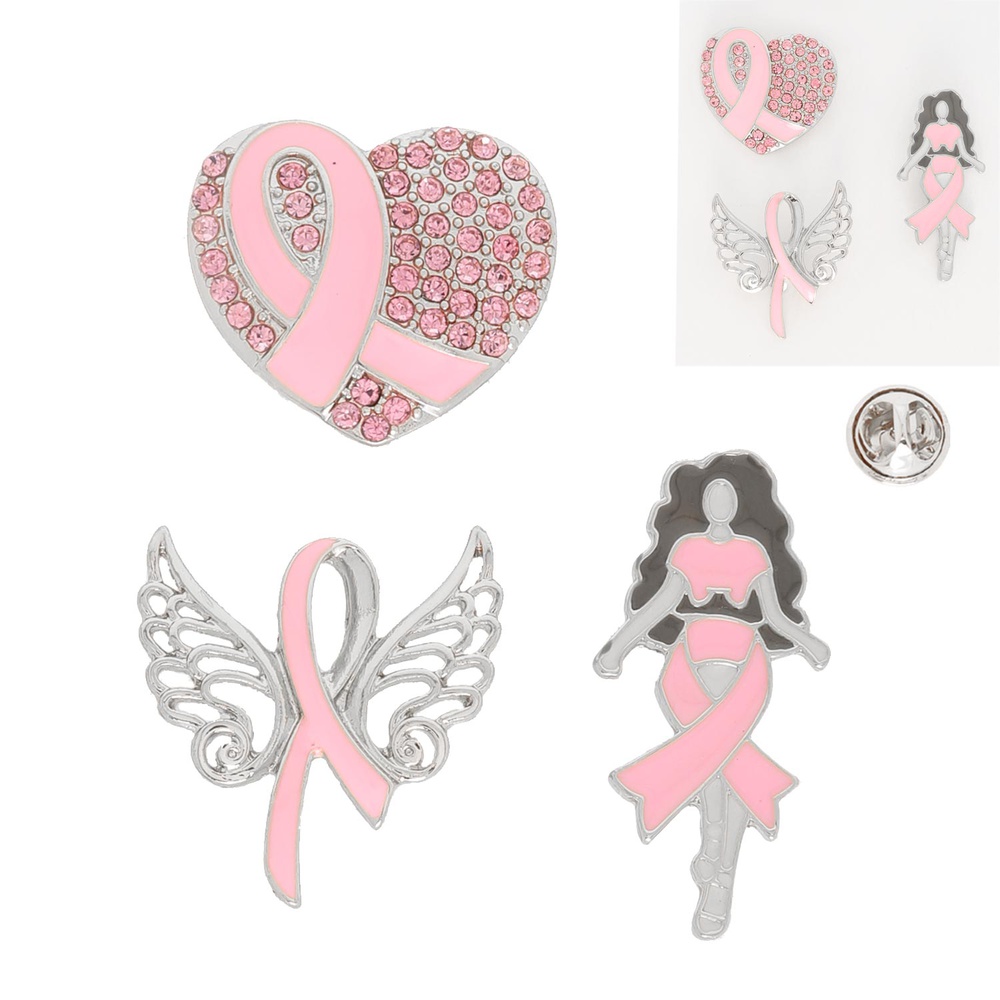 3-PACK BLACK GIRL MAGIC BREAST CANCER AWARENESS PINK RIBBON CRYSTAL RHINESTONE PAVE GLAM GIRL ENAMEL COATED ASSORTED BROOCH PIN SET