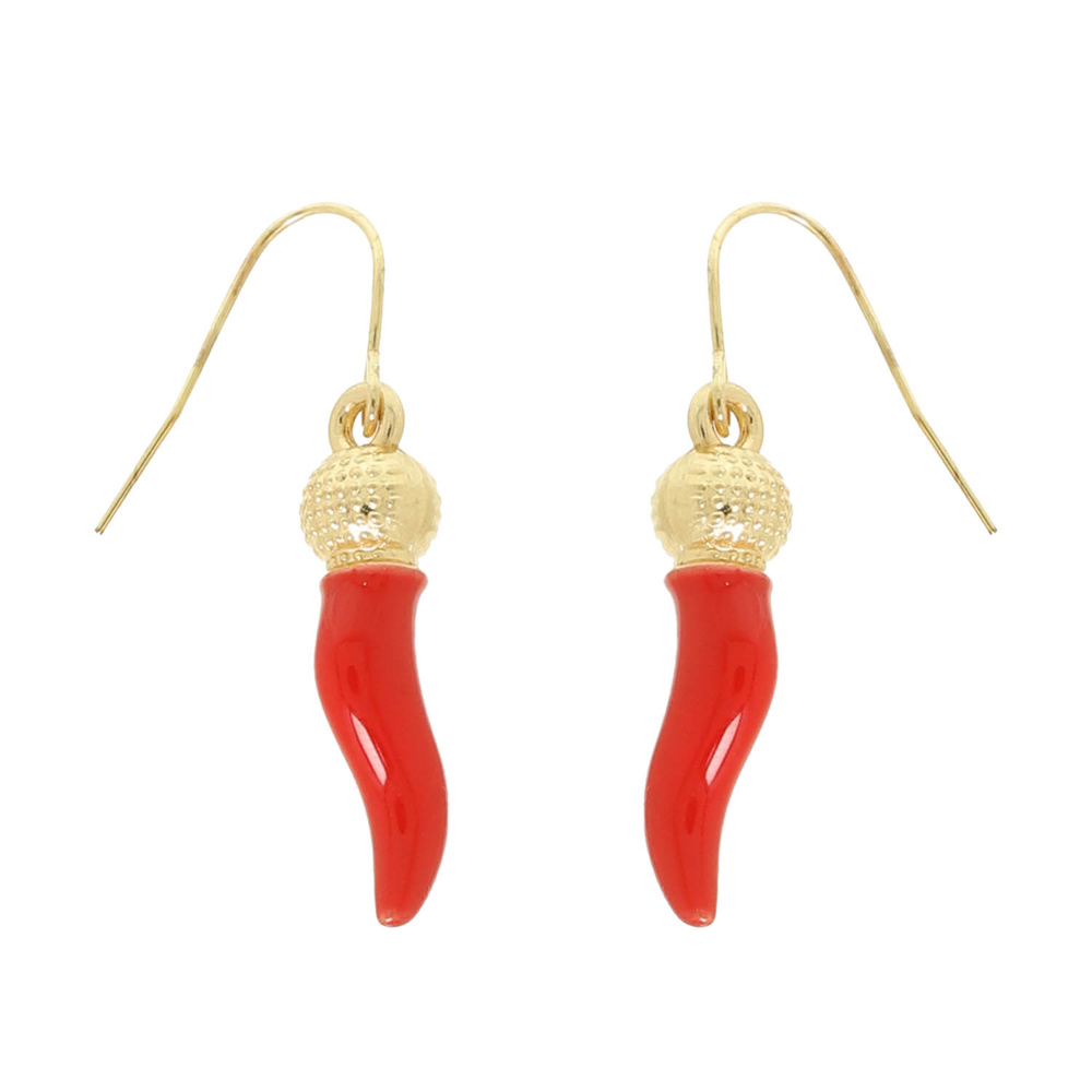 3D RED HOT ENAMEL CHILI PEPPER DANGLE EARRINGS IN GOLD TONE METAL