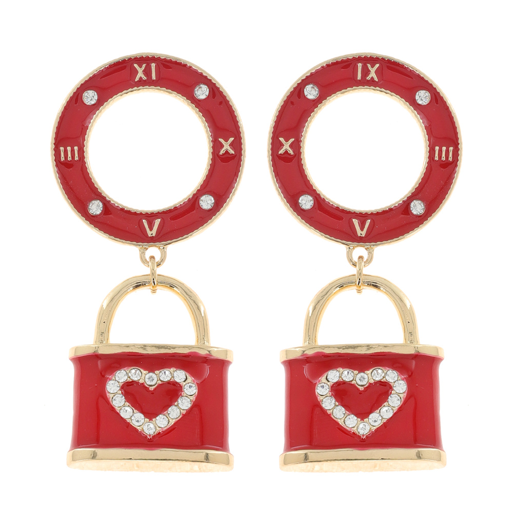 2-tier Roman Numerals Crystal Rhinestone Pave Open Circle Heart Design Padlock Dangle And Drop Enamel Coated Earrings