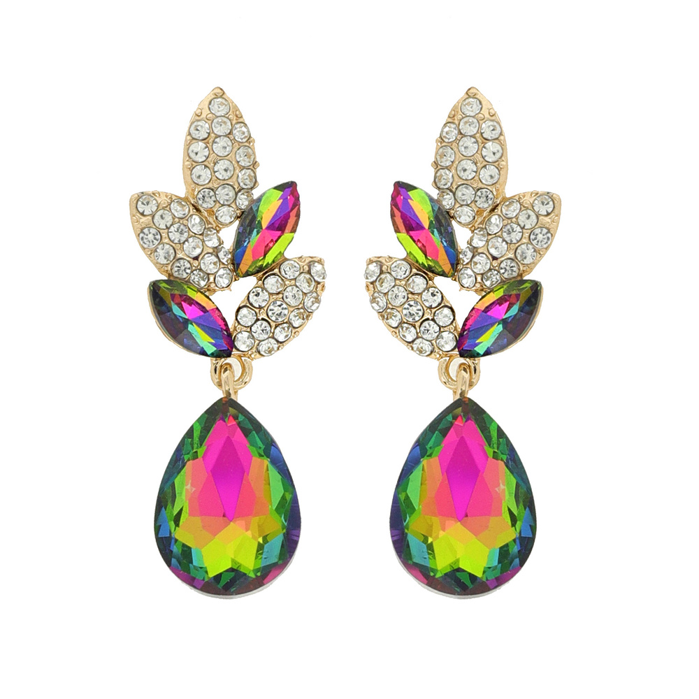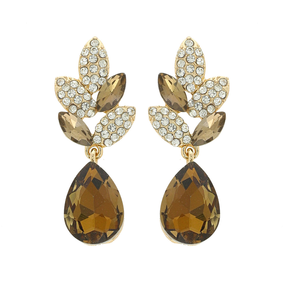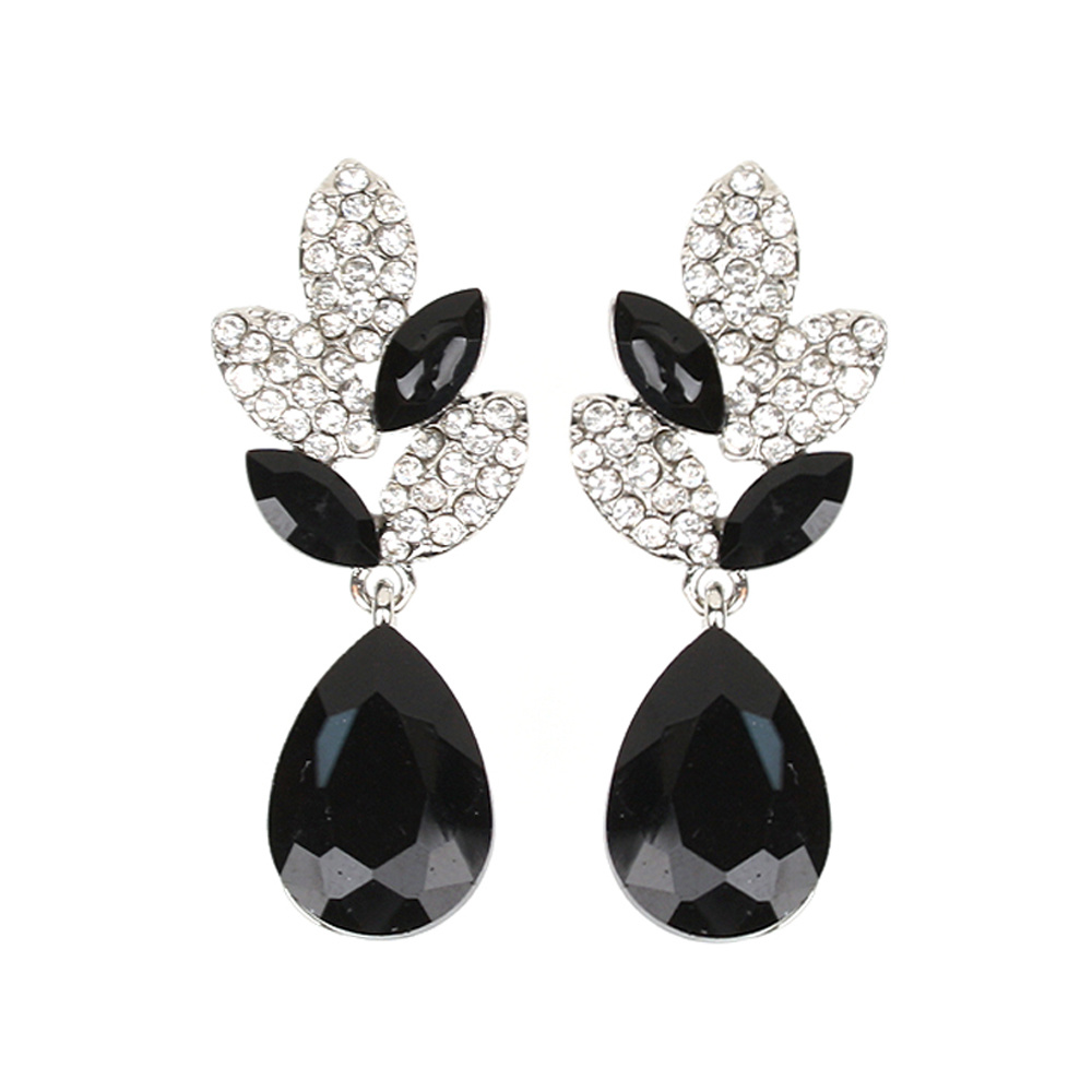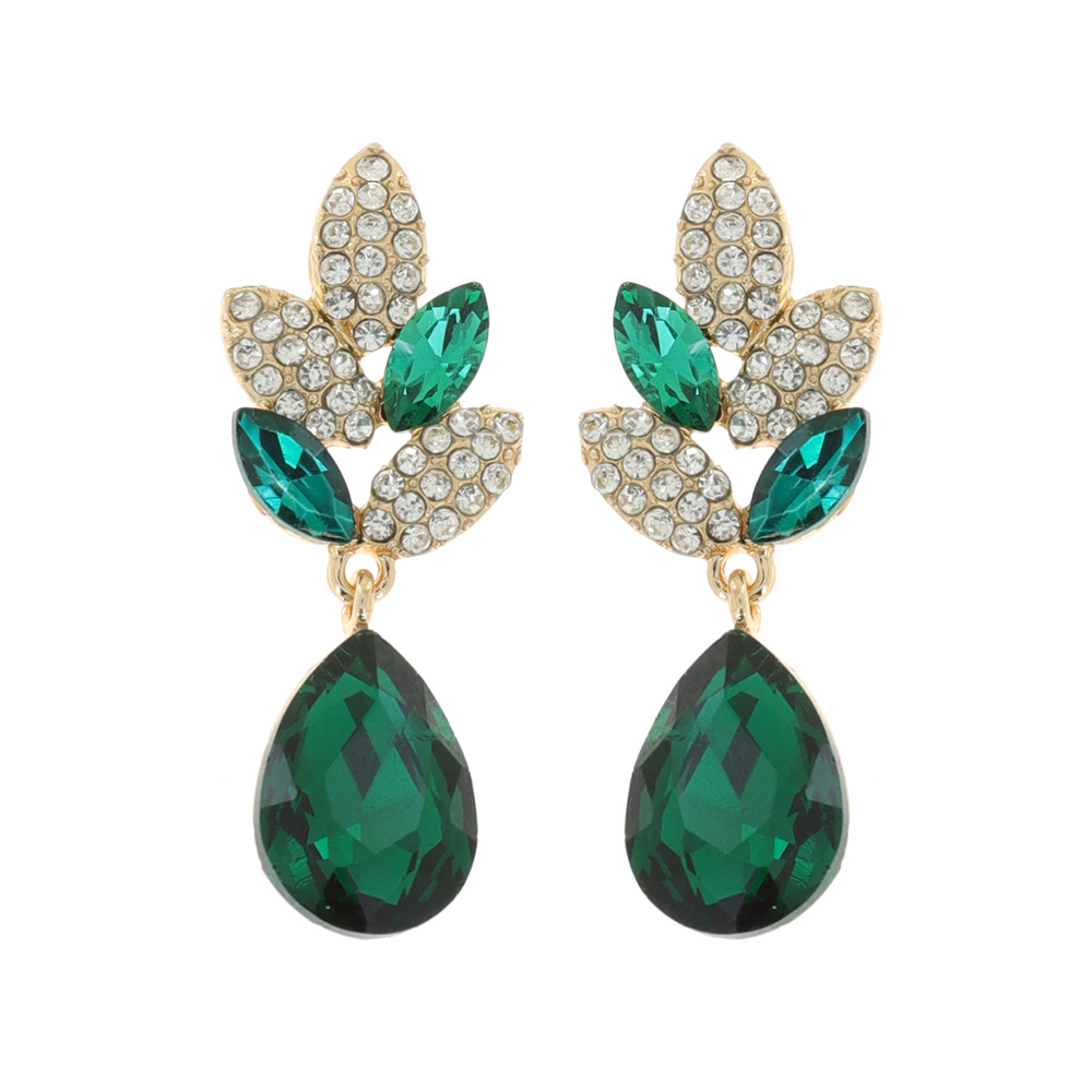 2-TIER CRYSTAL RHINESTONE LEAF ACCENT DANGLE AND DROP EARRINGS