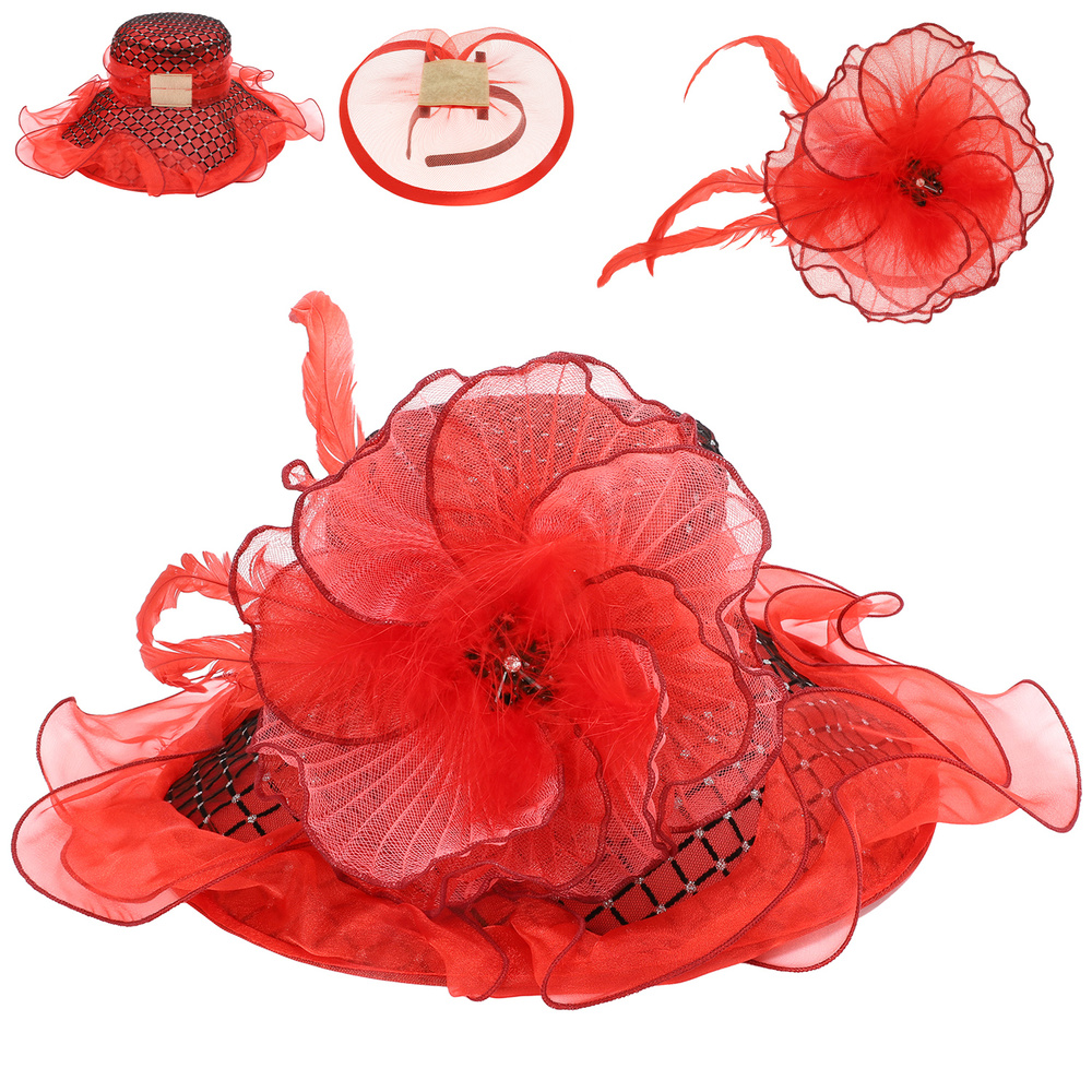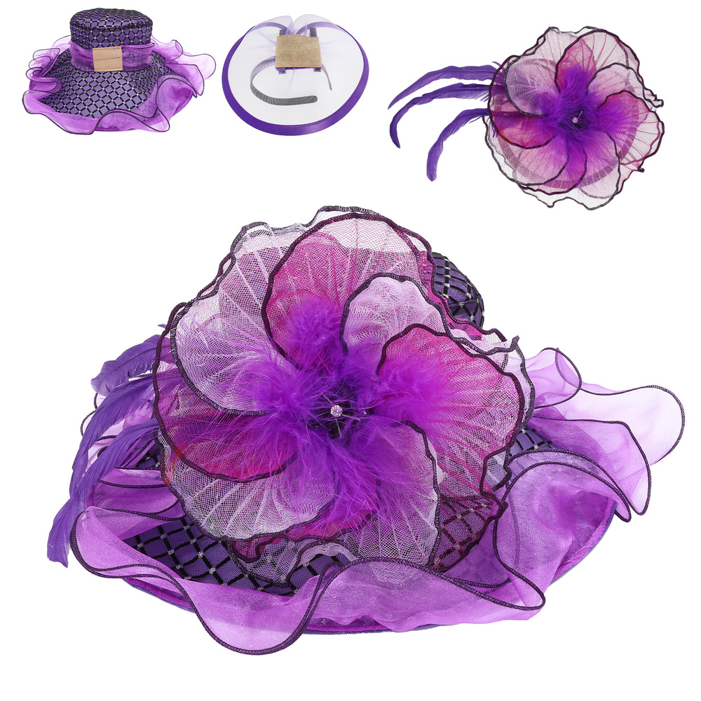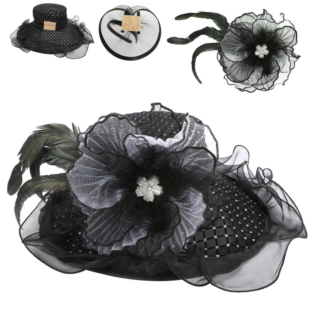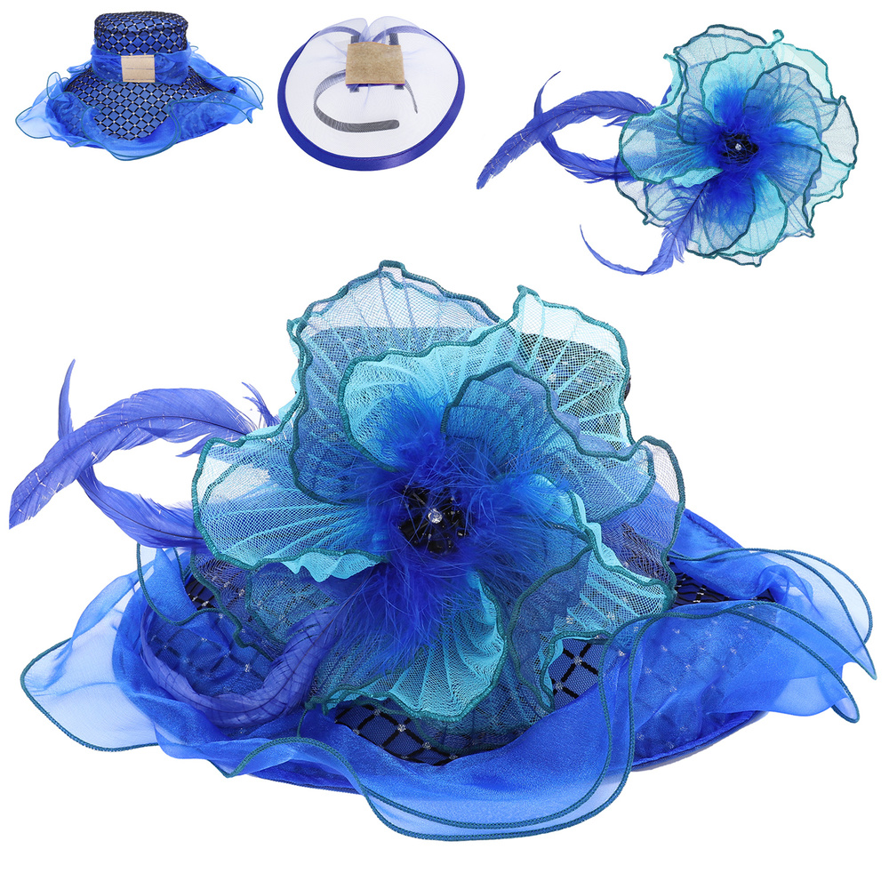 ORGANZA HAT WITH DETACHABLE FASTENED FLORAL FASCINATOR WITH CLIP AND SEPARATE HEADBAND