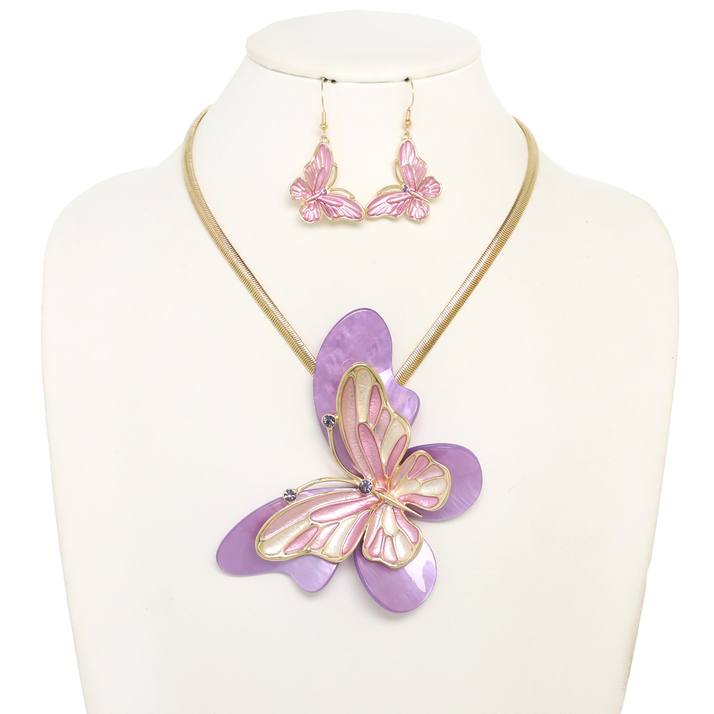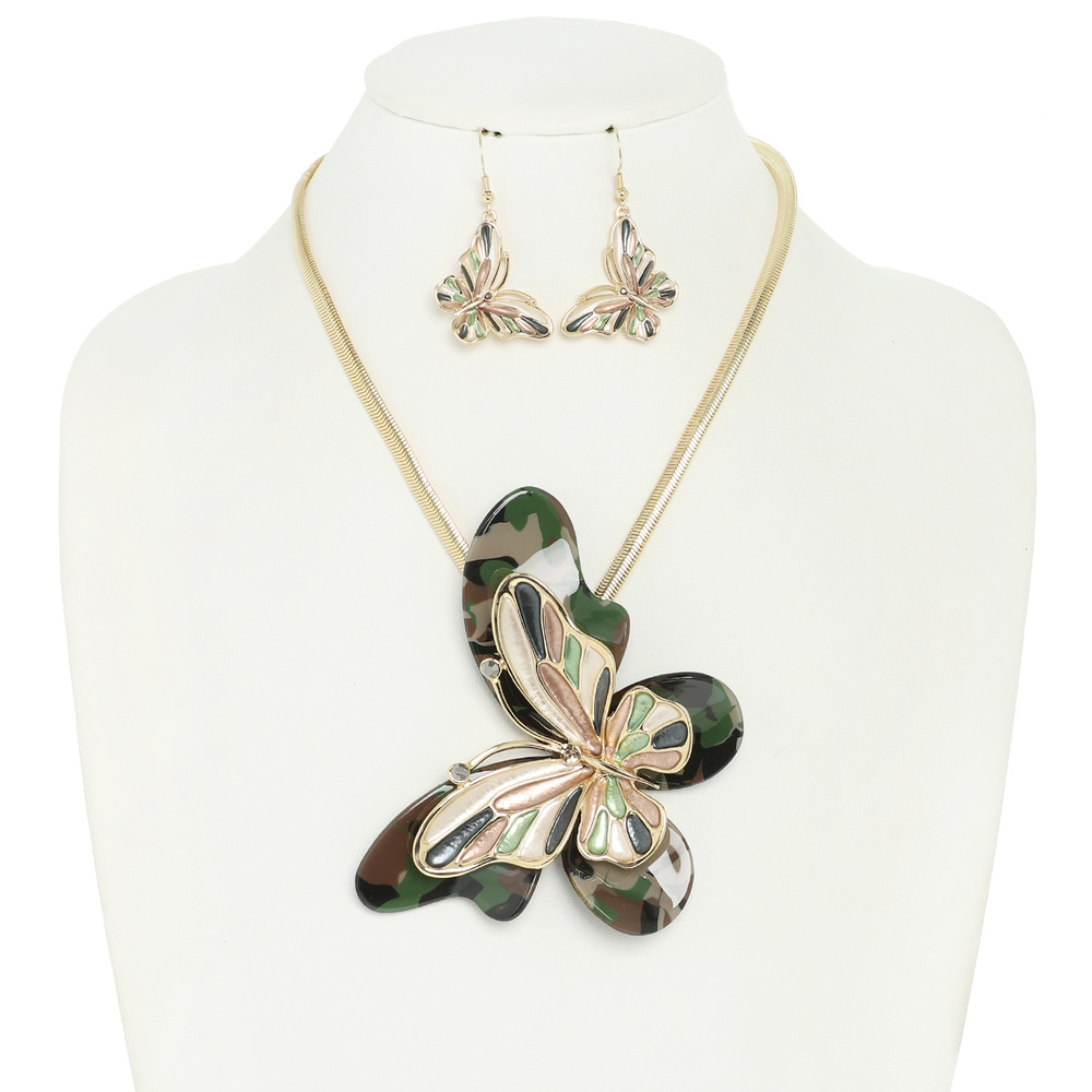 PATTERNED ACETATE RESIN CRYSTAL ACCENT BUTTERFLY NECKLACE EARRING SET