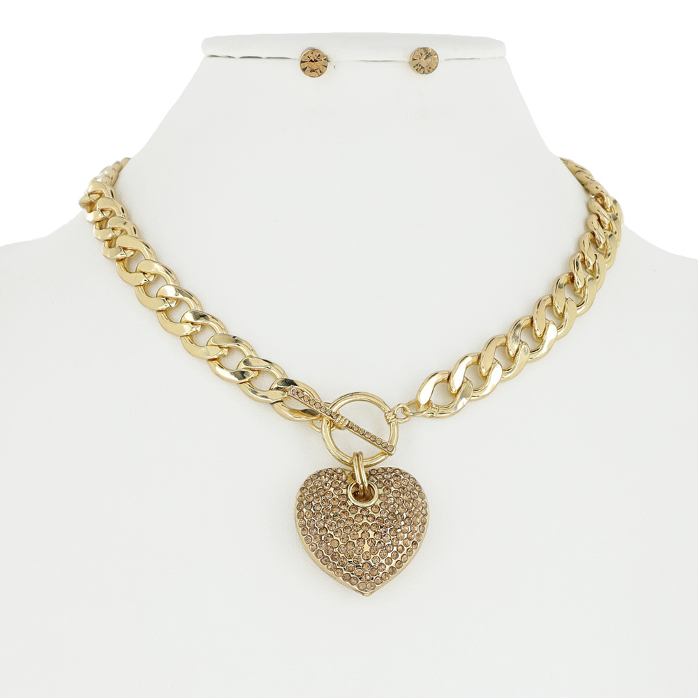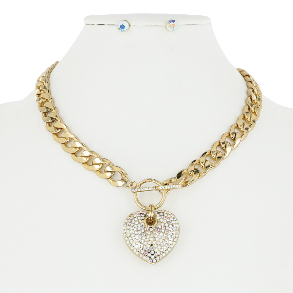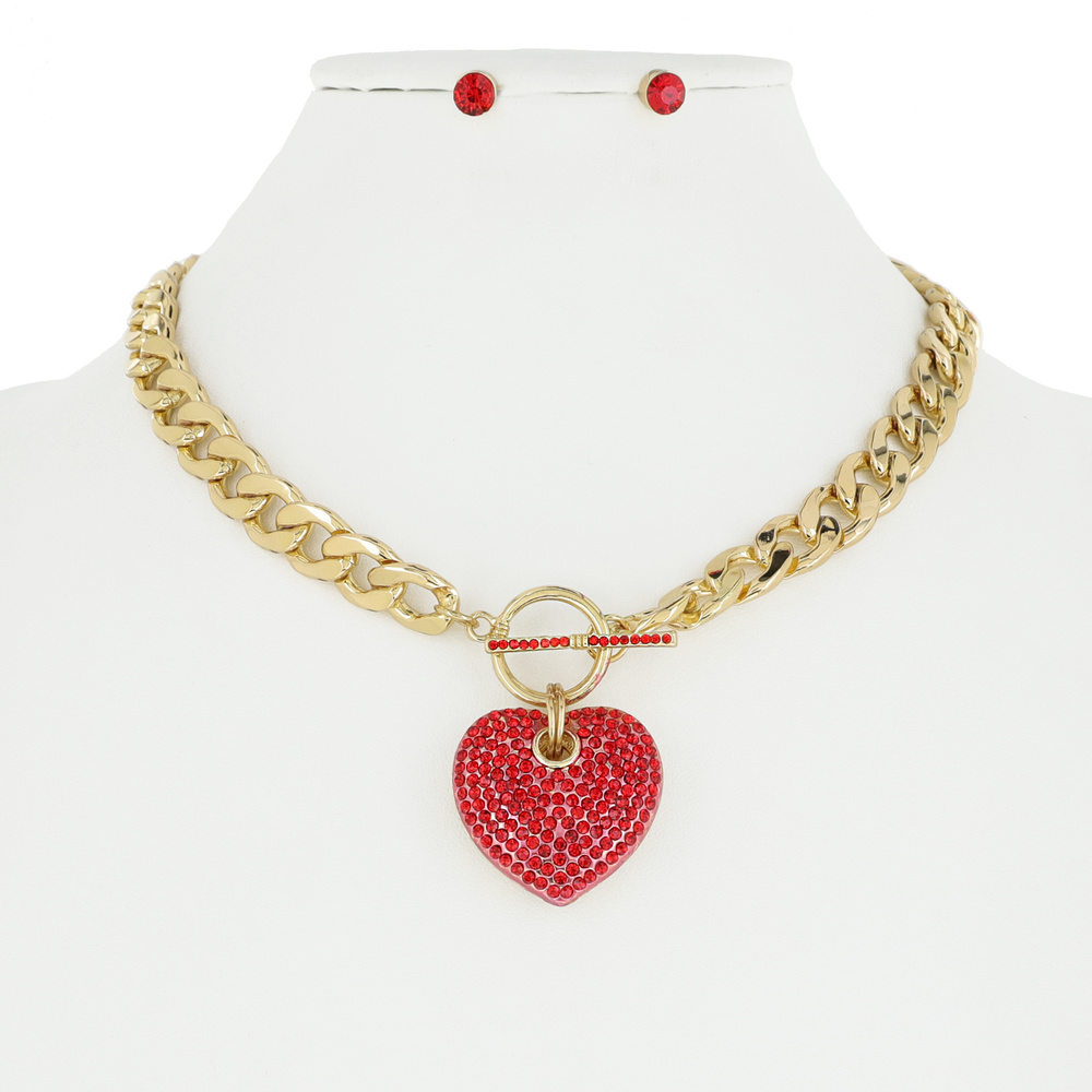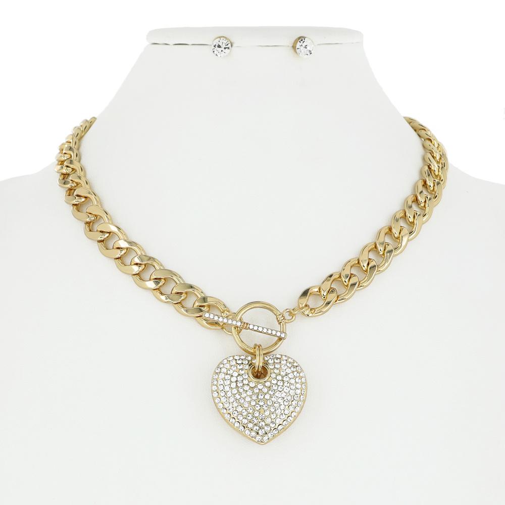 HEART RHINESTONE PENDANT TOGGLE CHAIN LINK NECKLACE AND EARRINGS SET