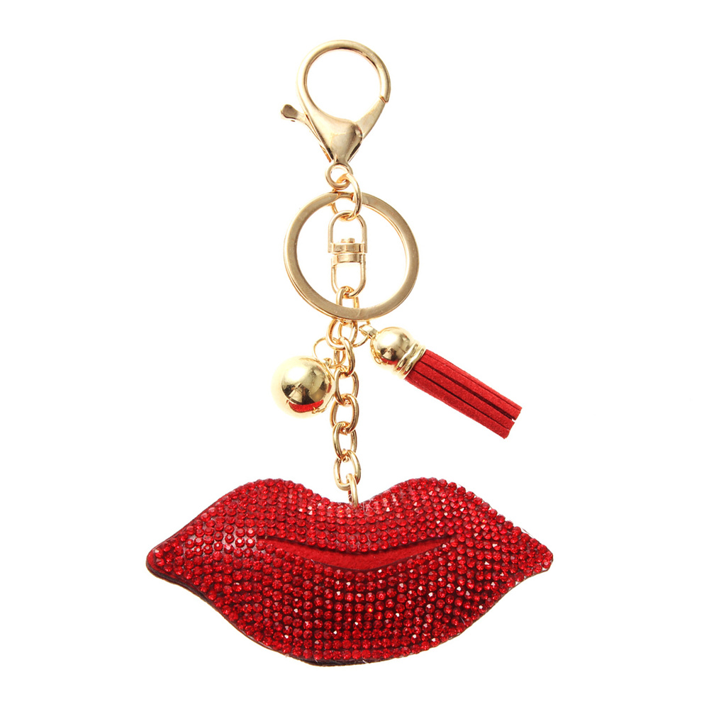 RED RHINESTONE PAVE LIPS KEYCHAIN WITH FRINGE SPLIT RING AND LOBSTER CLASP